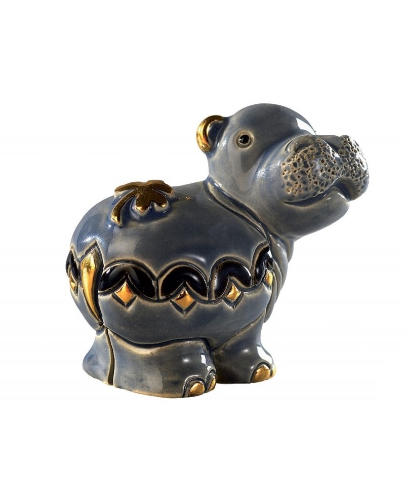 Statuette de mini hippopotame en céramique sculptée et peint à la main, émail coloré, pulvérisation or 18 carats et de platine.