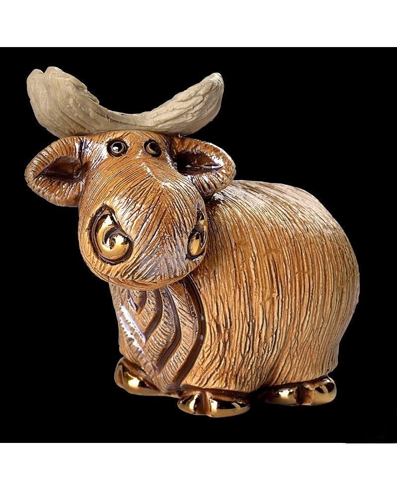 Statuette de mini élan en céramique sculptée et peint à la main, émail coloré, pulvérisation or 18 carats et de platine.