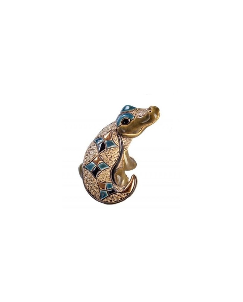 Statuette de bébé crocodile du Nil en céramique sculptée et peint à la main, émail coloré, pulvérisation or 18 carats et de platine.
