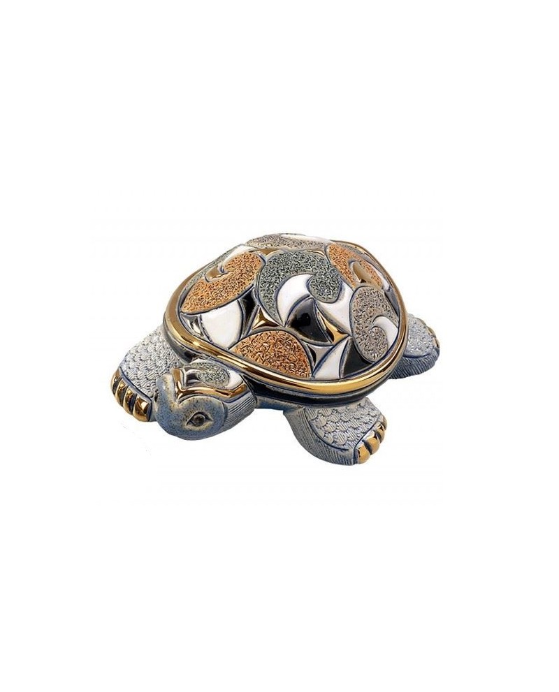 Statuette tortue Galapagos en céramique sculptée et peint à la main, émail coloré, pulvérisation or 18 carats et de platine.