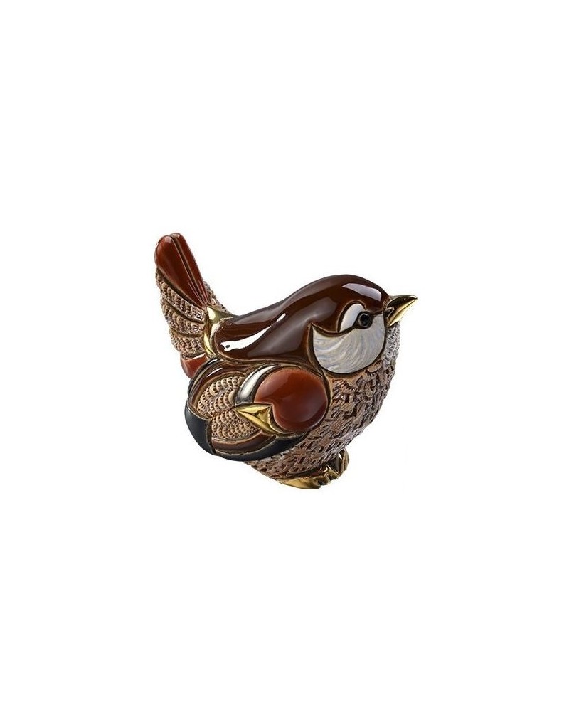 Statuette oiseau roitelet en céramique sculptée et peint à la main, émail coloré, pulvérisation or 18 carats et de platine.