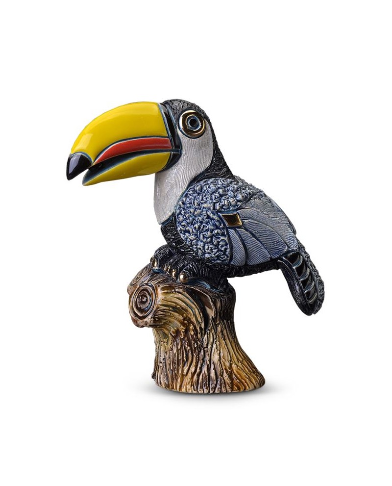 Statuette de toucan en céramique sculptée et peinte à la main, émail coloré, pulvérisation or 18 carats et de platine.