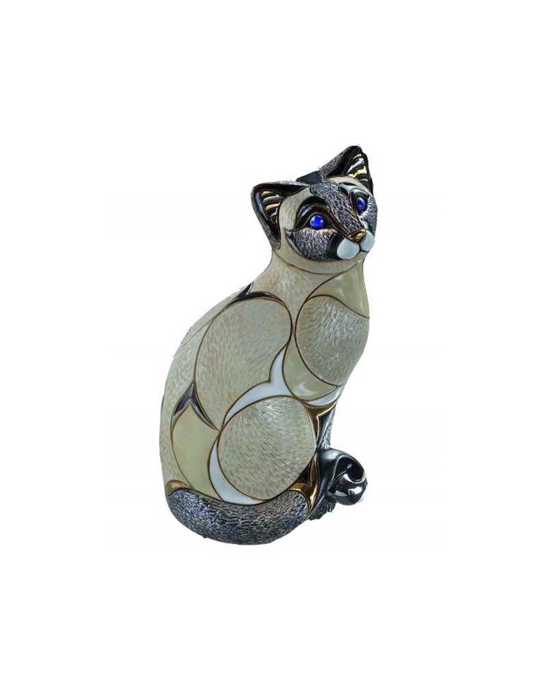 Statuette chat siamois en céramique sculptée et peinte à la main, émail coloré, pulvérisation or 18 carats et de platine.