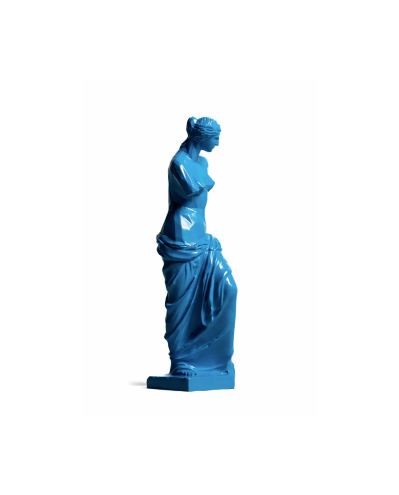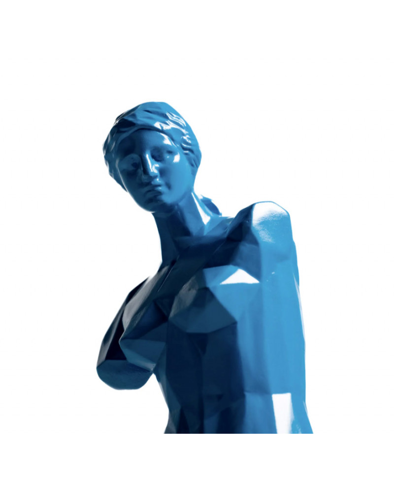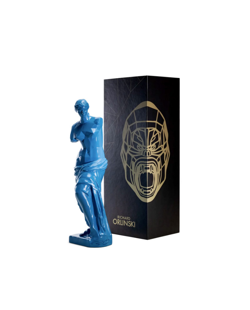 Cette Vénus, habillée pour sa moitié supérieure des facettes typiques du travail de Richard Orlinski, est aujourd’hui édité en grande taille, 35 cm de haut, avec une finition bleue azurite.