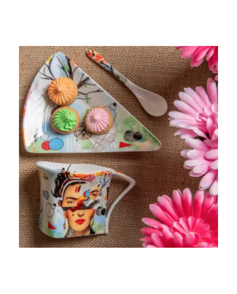 Cet ensemble de 2 tasses originales en forme de triangle de 180ml et ses sous-tasses est signé par un artiste australien, du nom de Loui Jover. Il représente le collage *Kahlo Analytica*, rendant hommage à l'icône Frida Kahlo. Cette œuvre créative inspire la modernité, grâce à un savant mélange de gouache, de déconstruction, et de formes géométriques. Le beau coffret aux couleurs vives en fait le cadeau idéal. Accessoires inclus: sous-tasses, cuillères