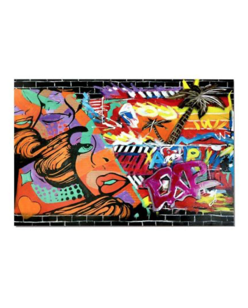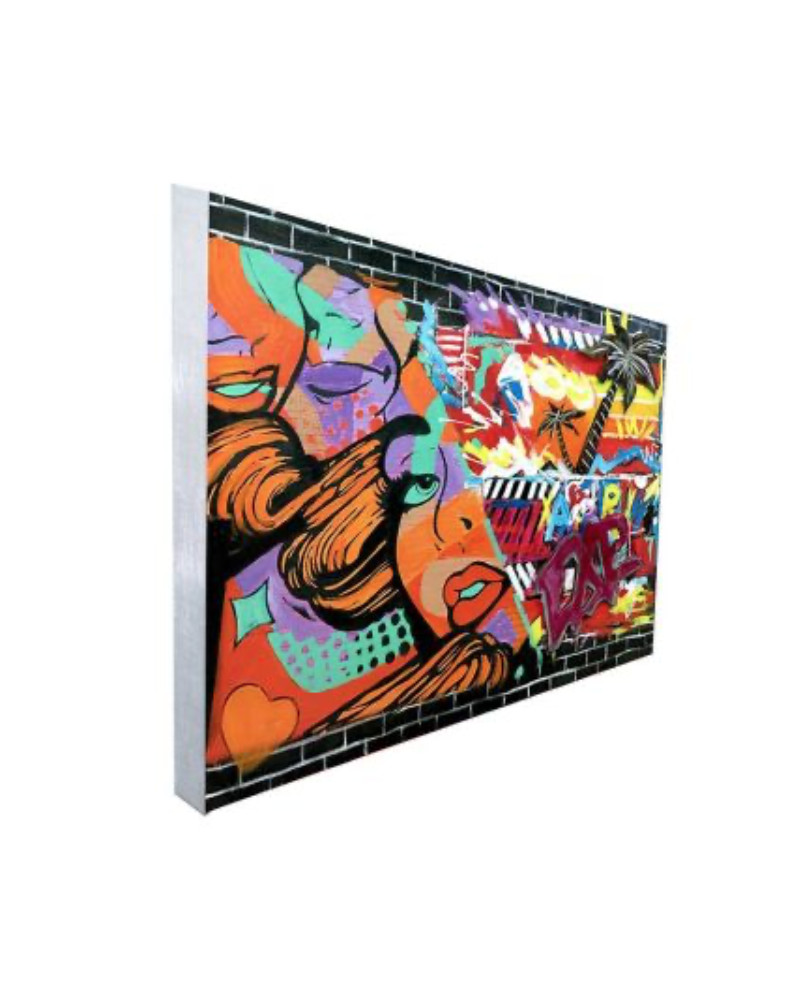 Craquez pour une oeuvre de la collection GALLERY. Ce tableau représente une femme dans le style *Street Art*, tel un véritable graffiti de rue. Admirez le travail de l'artiste, qui intègre de véritables morceaux de métal pour un effet 3D exceptionnel (palmiers, graffiti). Toile peinte à la main.
