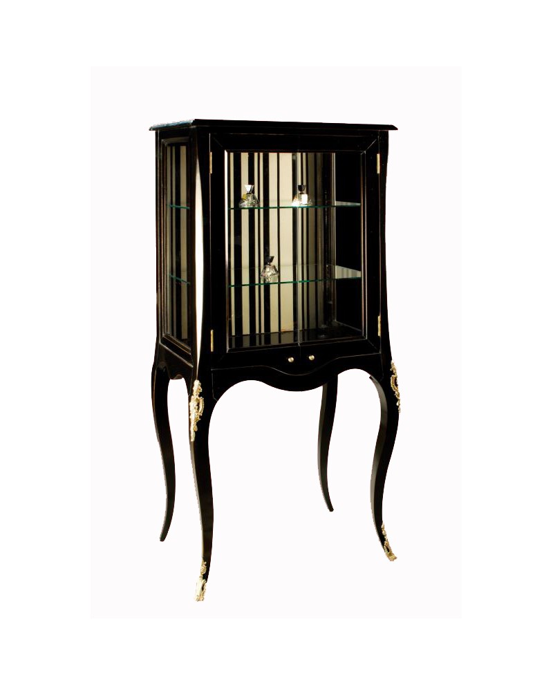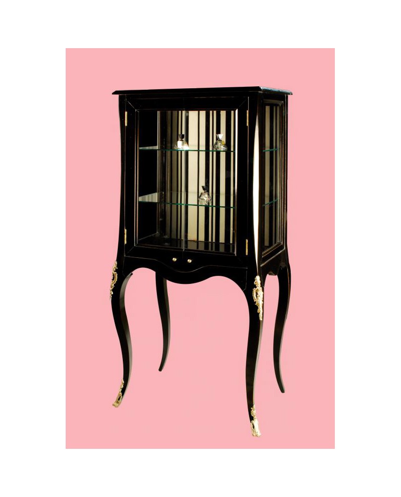 Vitrine 2 portes "Les Parisiennes", 2 étagères en verre. Bois merisier massif, décor laqué noir intérieur rayures argent, finition patiné 1/2 antiquaire.