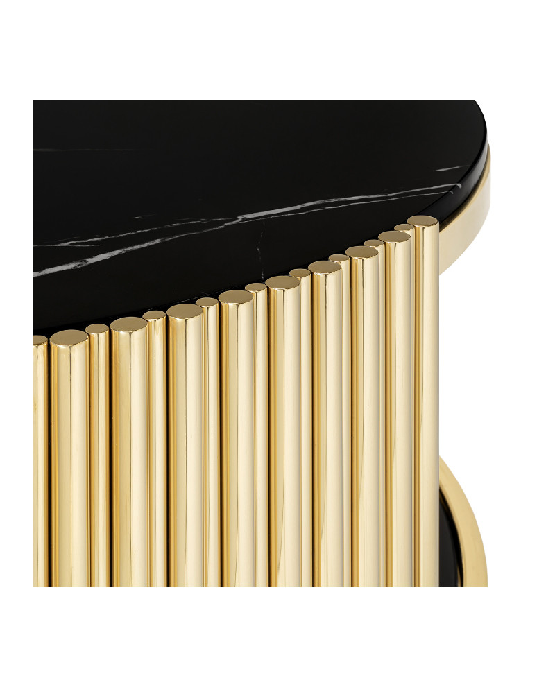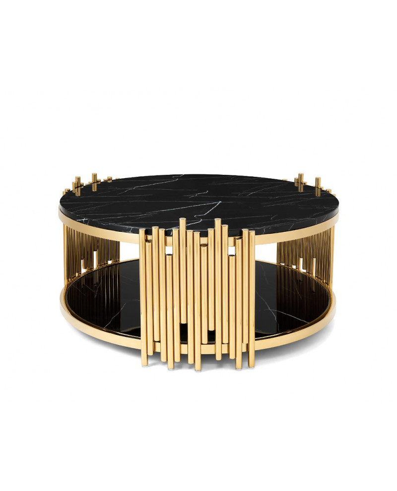 Magnifique table basse ronde modèle Jack en métal doré brillant et 2 plateaux en pierre finition marbre noir.