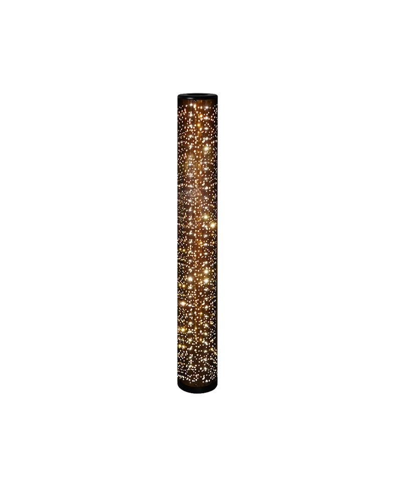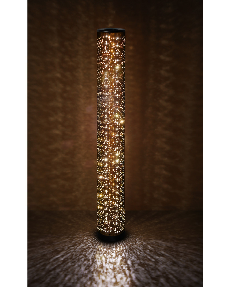 A travers l'écran en tissu avec des découpes, des effets de lumière dorés scintillent.