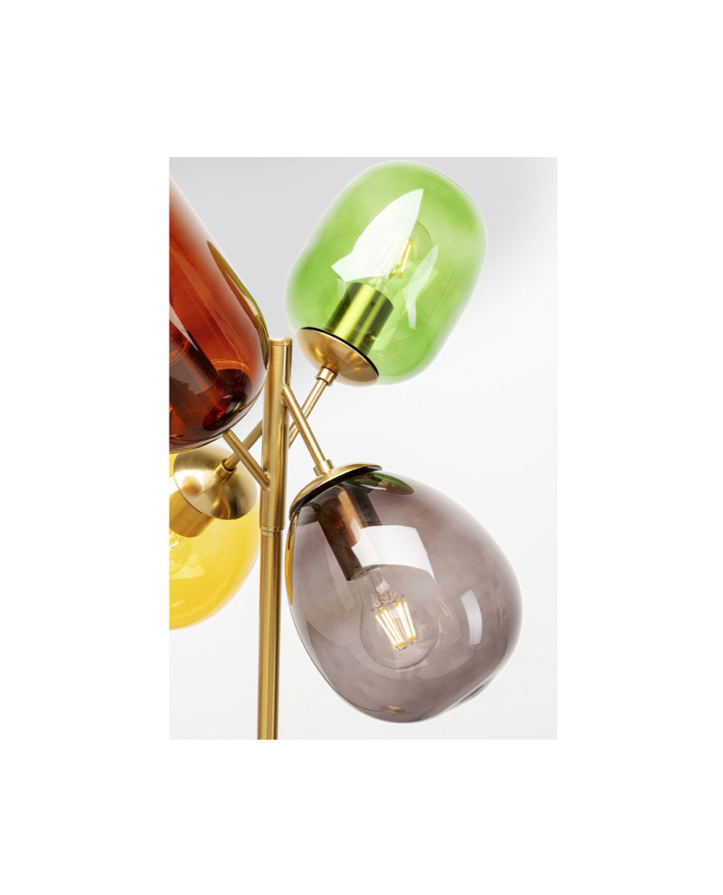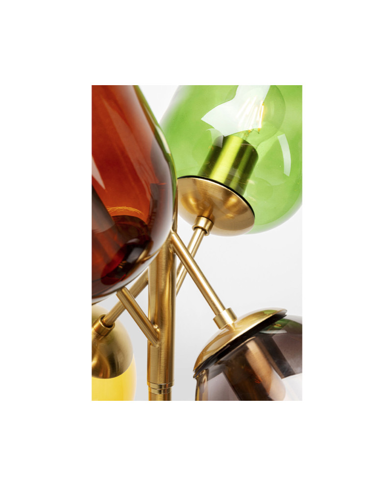 Les abat-jour en verre semi-transparents marron, gris, vert et jaune scintillent délicatement grâce à leur finition laiton.