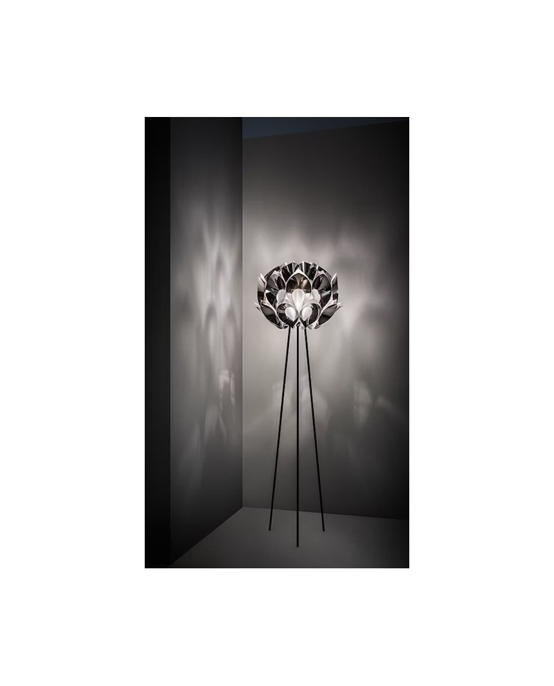 Dans une terre gorgée de soleil, la nature, les couleurs et l'expertise artisanale donnent vie à des pièces très expressives, denses d'archétypes, dont Flora, la collection inspirée de la plante Monstera Deliciosa. Soixante pétales entourent une sphère de satin illuminée par son cœur. La lampe est disponible en version suspension, ainsi qu'en version sol reposant sur de fines pattes qui ressemblent aux pistils d'une fleur. La finition brillante des pétales, à laquelle nous avons ajouté le gris acier, s'obtient grâce à un système innovant de vaporisation d'aluminium qui crée un jeu évocateur sur la lumière, apparemment dérobée au soleil à son zénith.