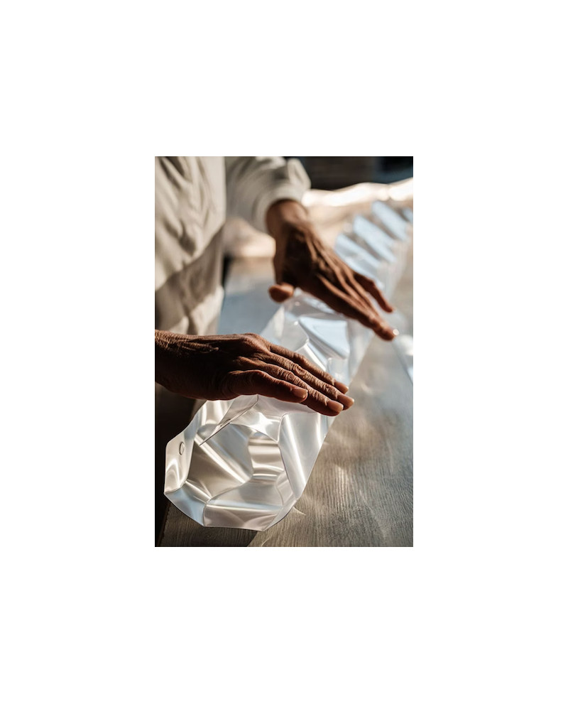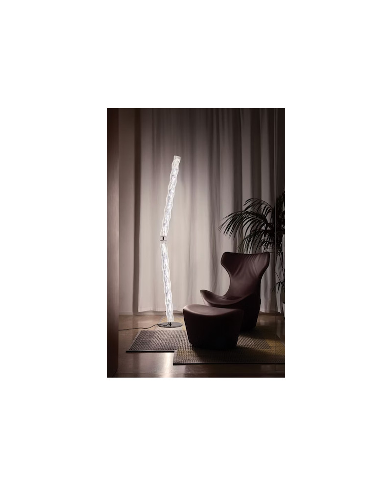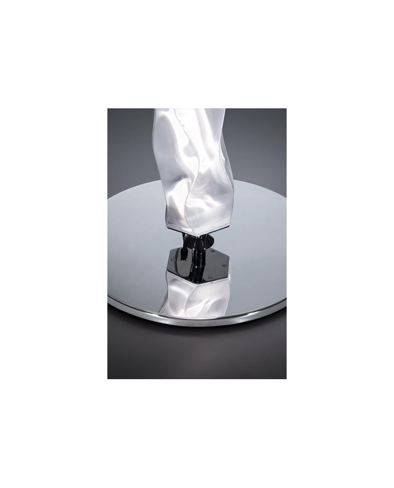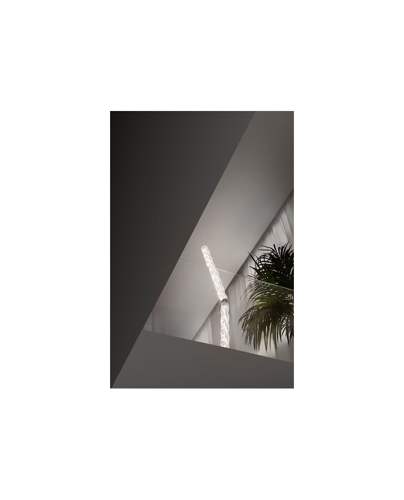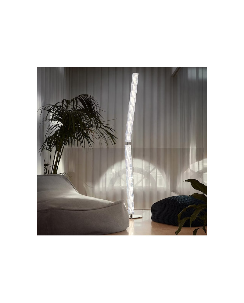 Solide, mais fluide : l'effet magique est créé avec un cadre en acier invisible caché sous des couches de Lentiflex® innovant de Slamp, un matériau qui liquéfie l'éclairage LED. La lumière se transforme en une lueur douce, uniforme, presque légère, flottante. Le design et la courbure du lampadaire ont été inspirés par les mains tendues du « Jugement Dernier » de Michel-Ange dans la chapelle Sixtine. Le système de gradation tactile léger est placé de manière ergonomique et clignote lorsque la lampe est à une luminosité minimale et maximale. Tout comme le système Hugo Suspension, Hugo Floor respecte la norme UNI EN 12464 pour l'éclairage des bureaux. Le transformateur se branche et le cordon est noir pour éviter de montrer de la saleté tout en reposant sur le sol. Il est très facile à assembler : les deux modules ont une inclinaison prédéfinie, et se connectent simplement ensemble.