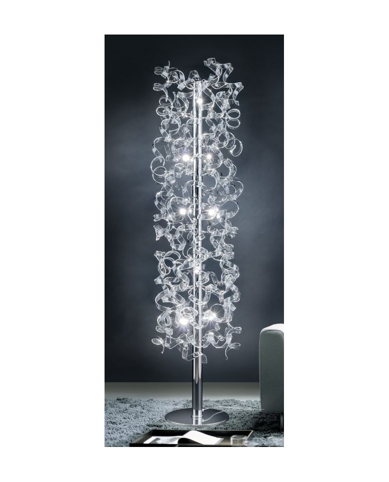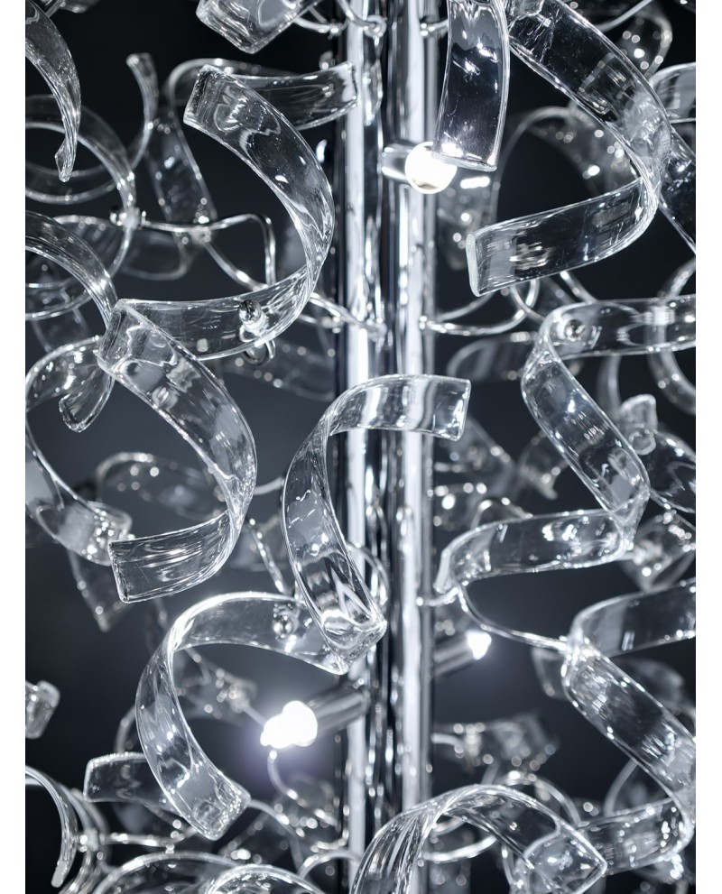 Magnifique lampadaire avec spirales en verre blanc transparent. Structure en métal chromé. Chaque bras est maniable.