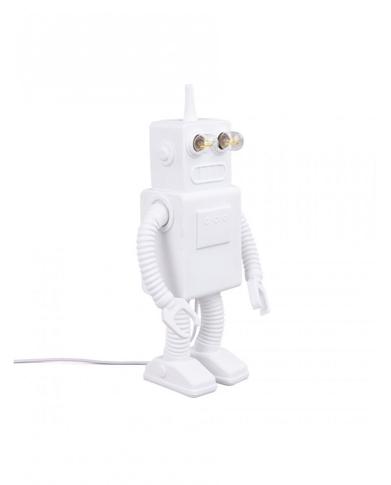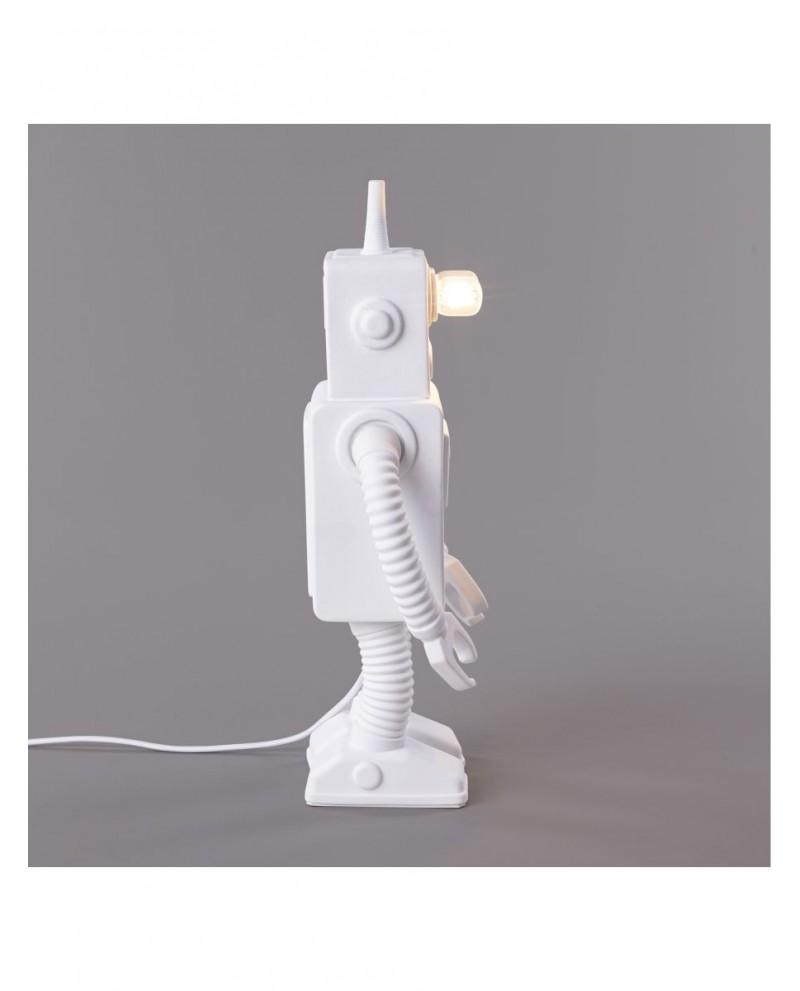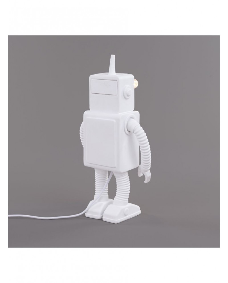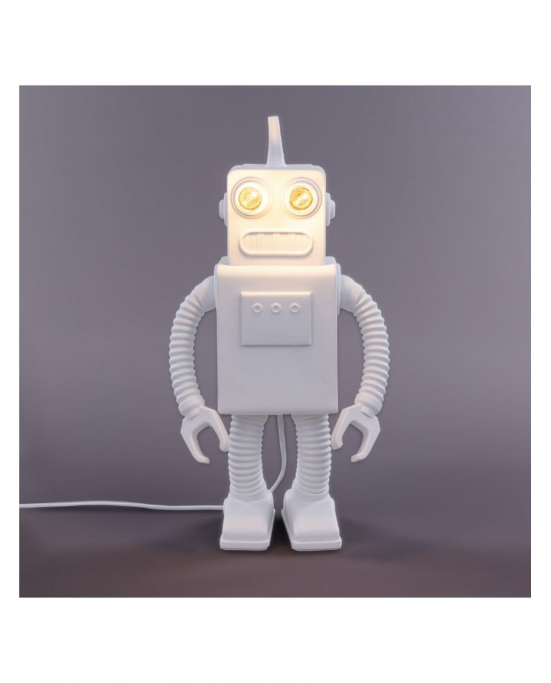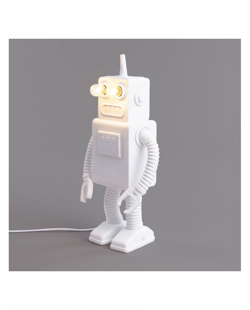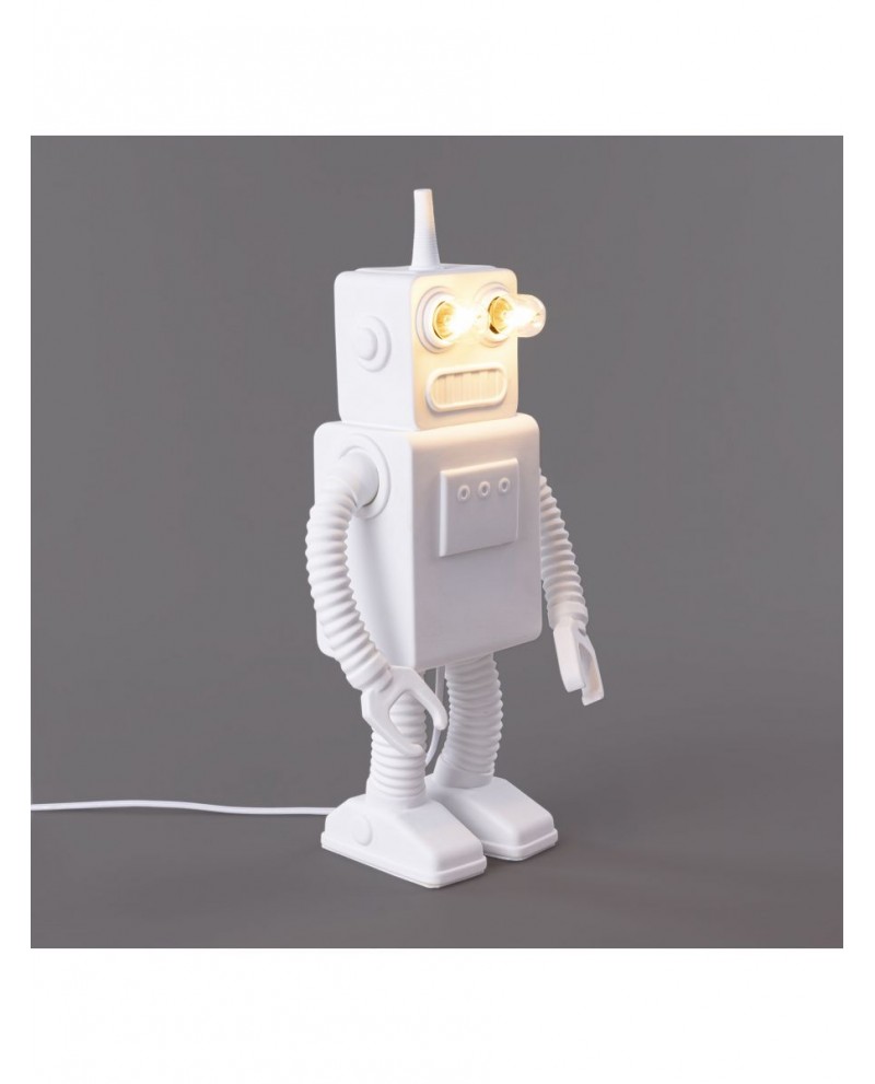 Directement de la salle de jeux à votre salon, Robot est une lampe à poser en porcelaine blanche, prête à vous illuminer de sa vue brillante.