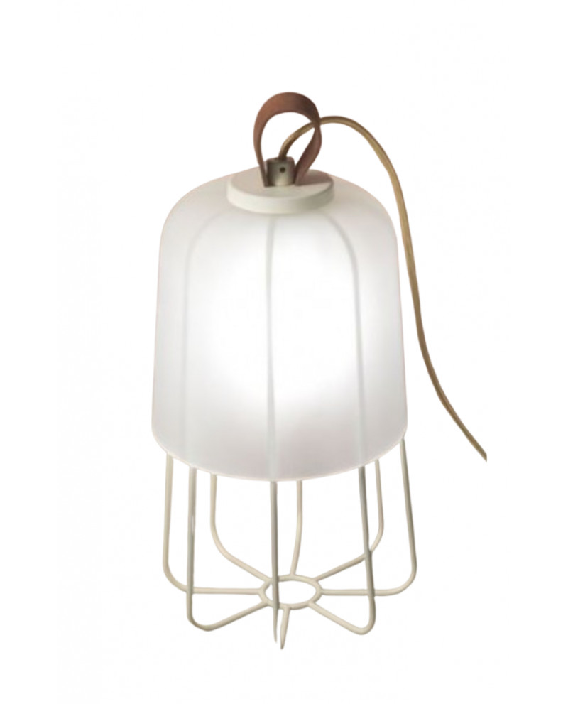 Lampe en métal finition blanc mat, verrerie opaline, câble en tissu blanc longueur 3m. Poignée déco en cuir.