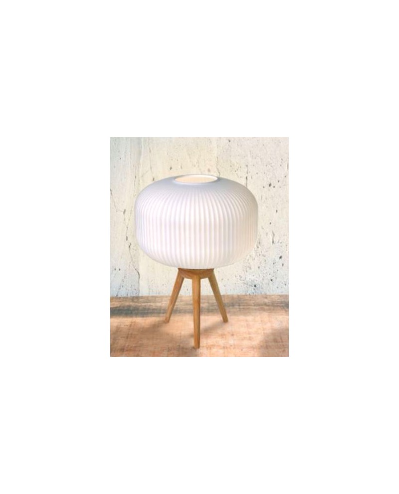 Lampe en verre opaline striée et piètement bois. Amp. 1 x E27 600W (ou plus si amp. LED), ampoule non incluse.