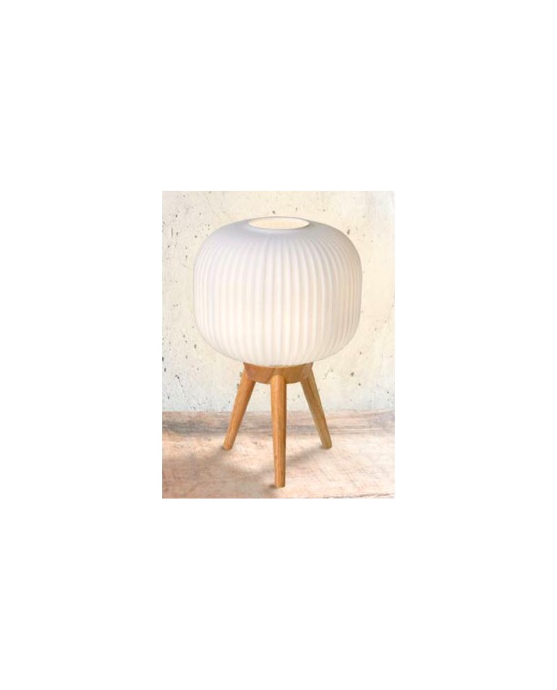 Lampe en verre opaline striée et piètement bois. Amp. 1 x E27 600W (ou plus si amp. LED), ampoule non incluse.