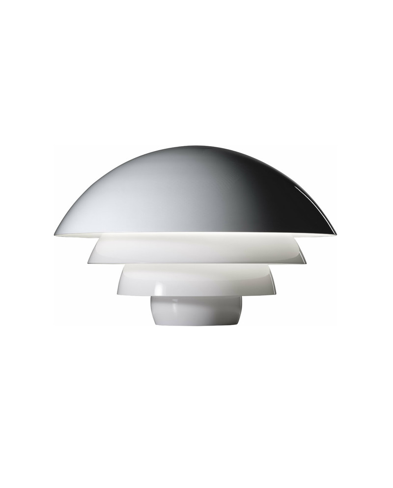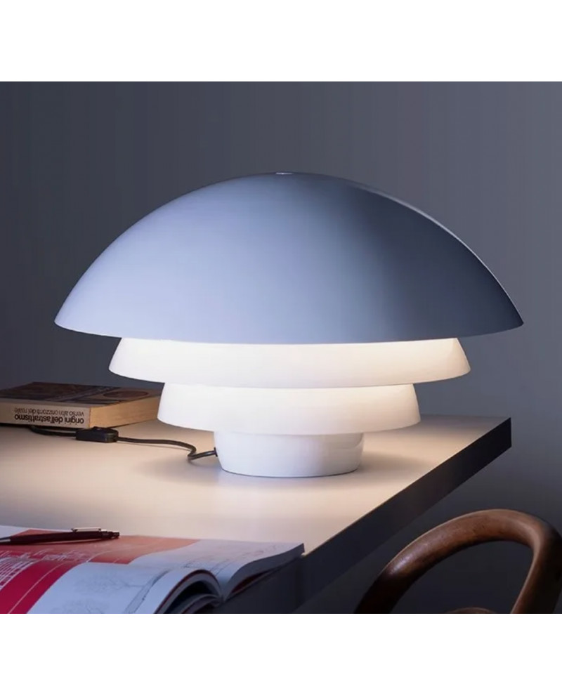 Lampe de table à lumière indirecte, initialement conçu pour les cercles fluorescents, signe de la nécessité déjà ressentie d'une meilleure utilisation de l'énergie, il est aujourd'hui reproposé pour les ampoules LED. Les éléments en aluminium peints en blanc sont fixés à l'axe de support central au moyen d'un petit bouton. Base semi-sphérique câblée pour ampoules LED.