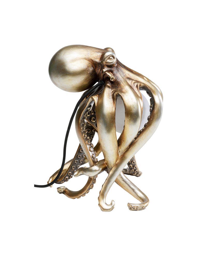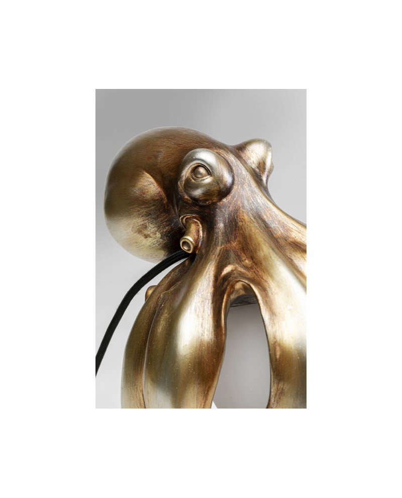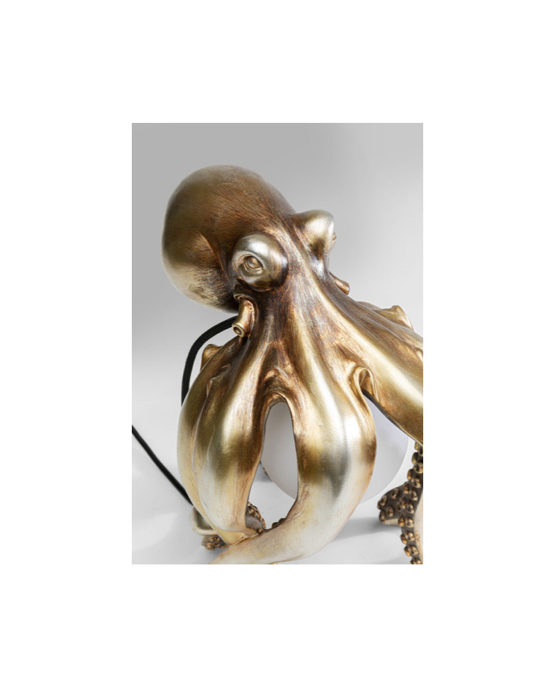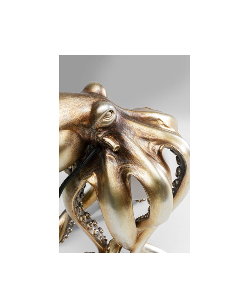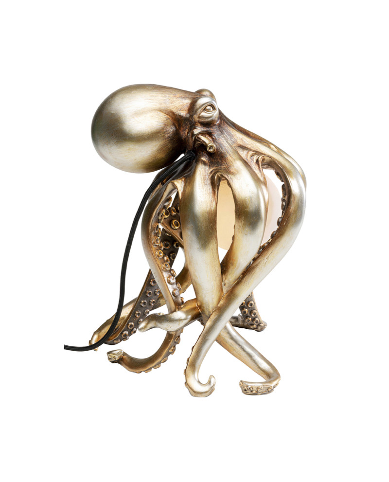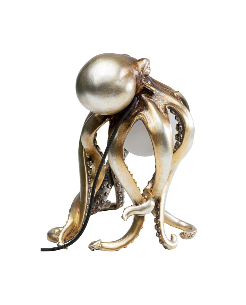 Originale lampe de table avec un pied doré en forme de pieuvre et dont certaines parties sont réalisées à la main