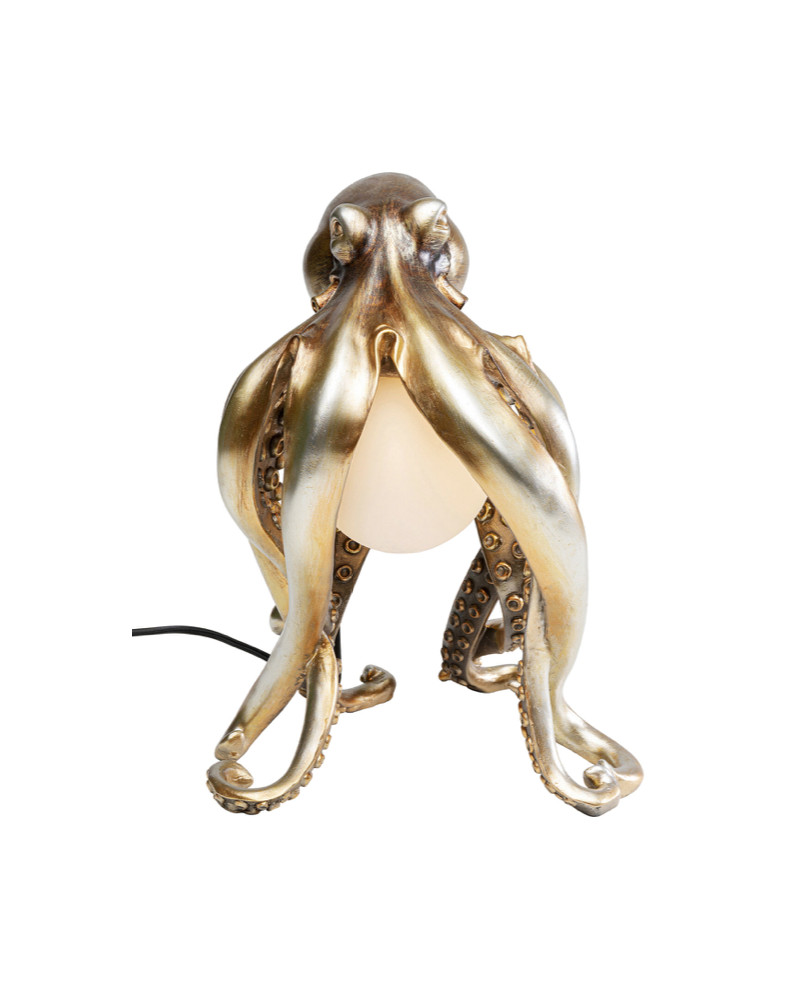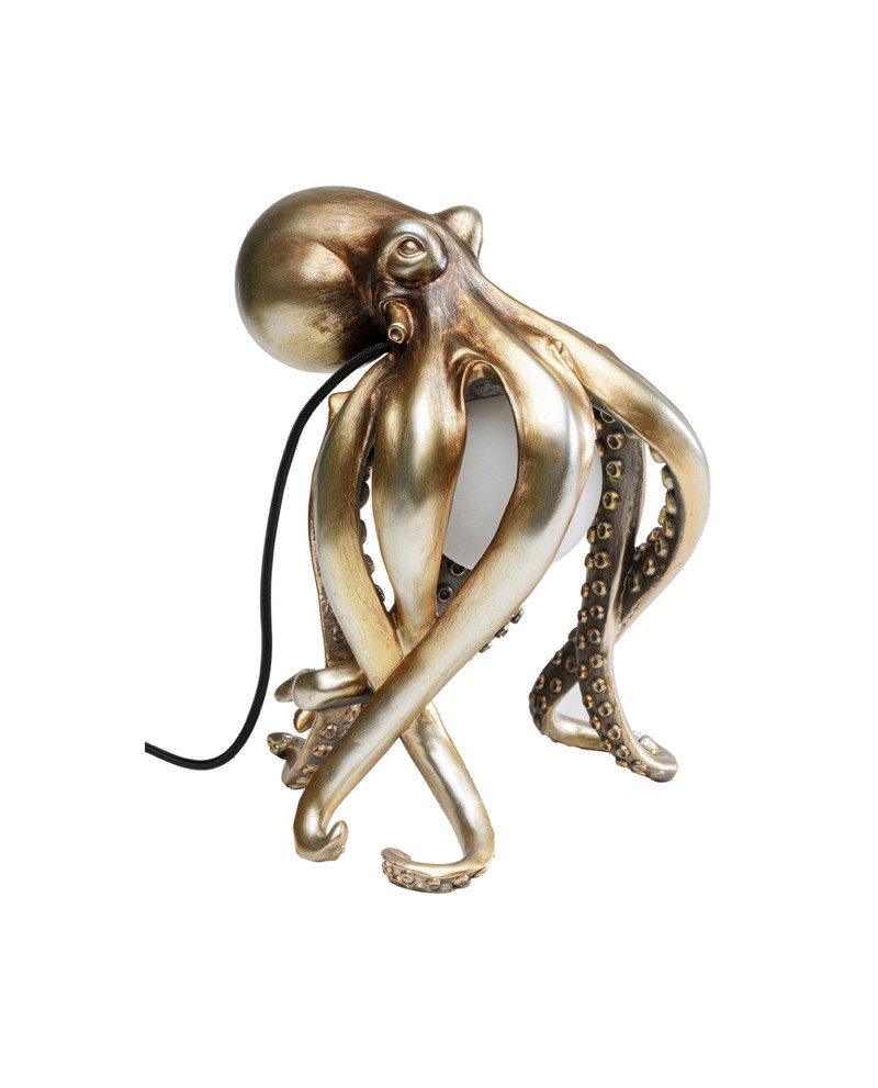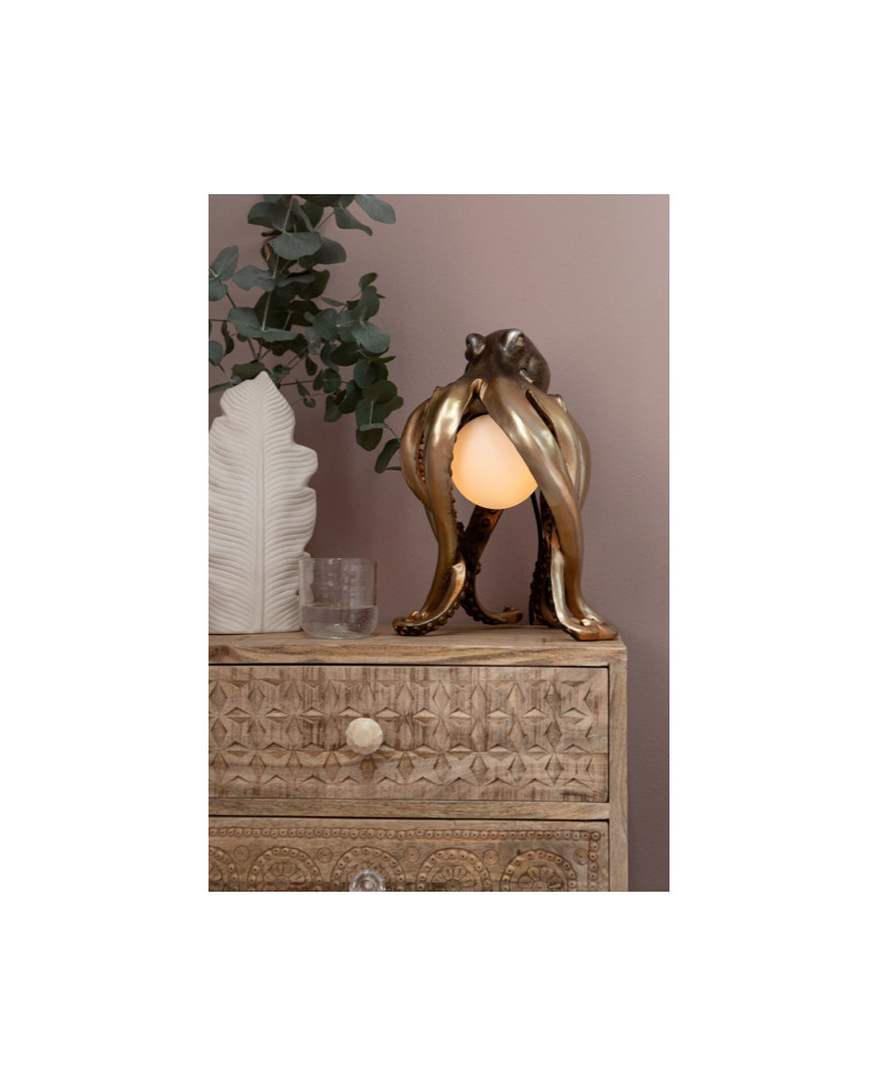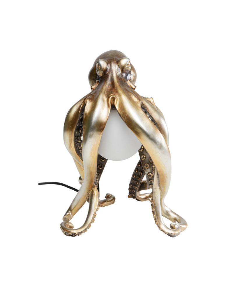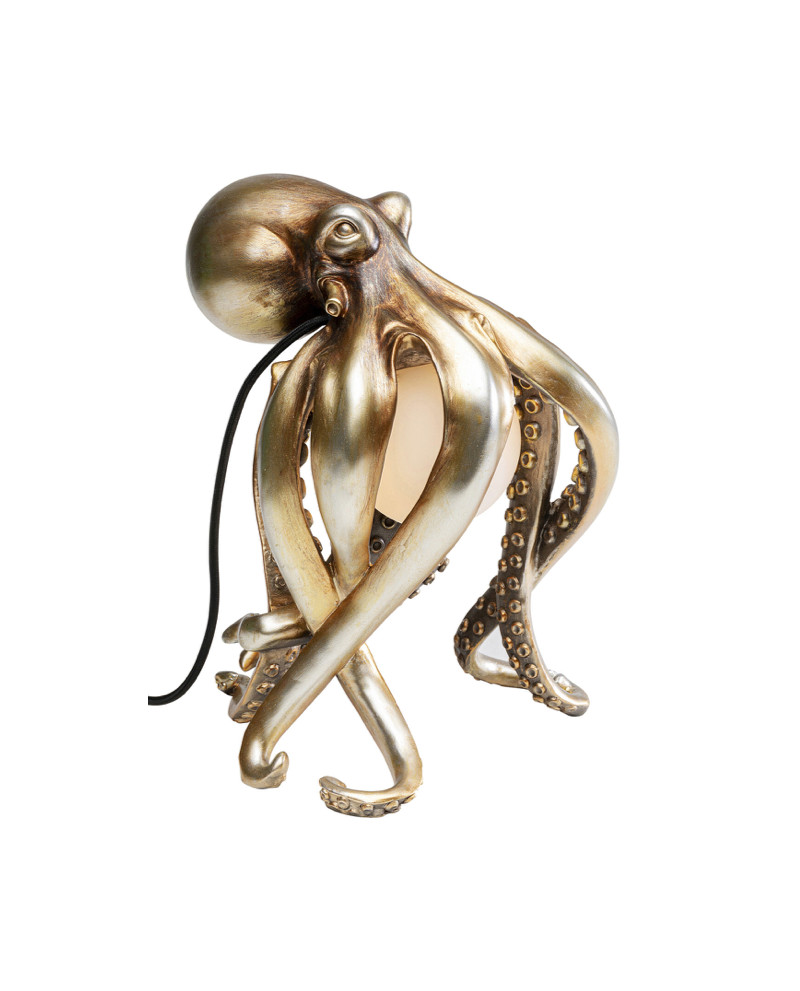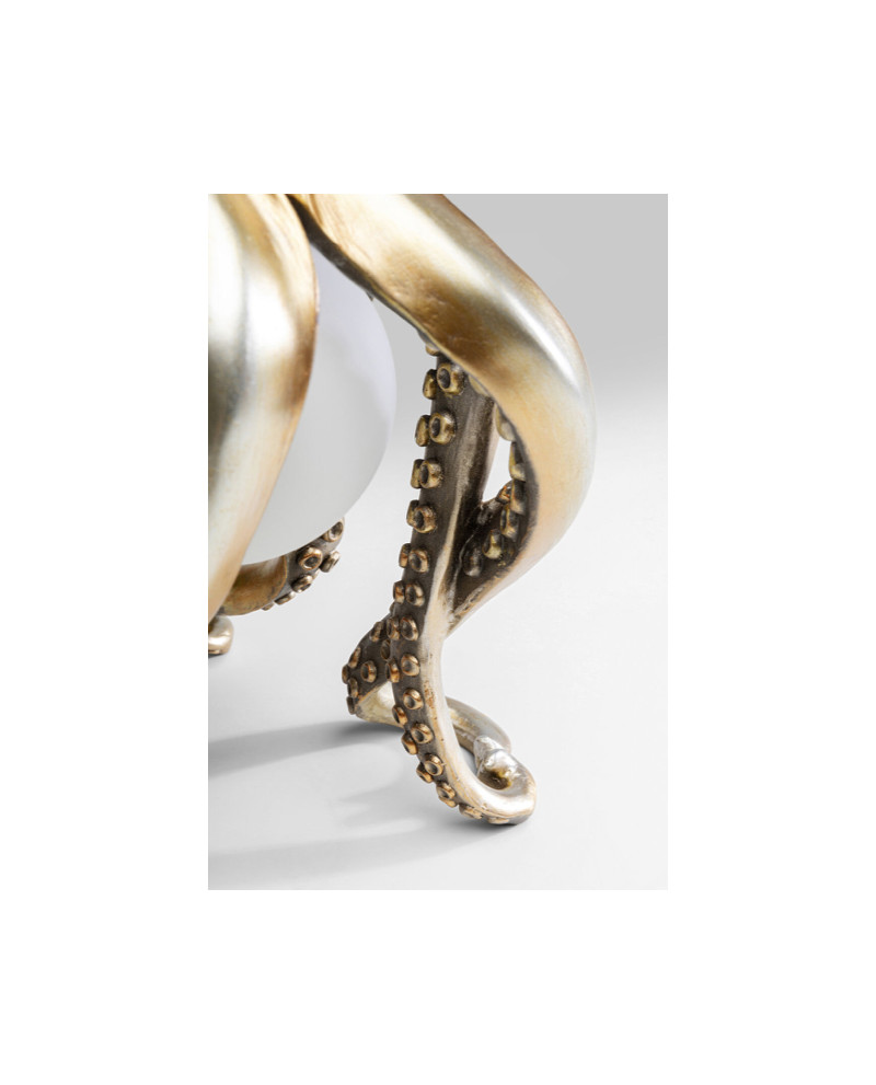 Originale lampe de table avec un pied doré en forme de pieuvre et dont certaines parties sont réalisées à la main