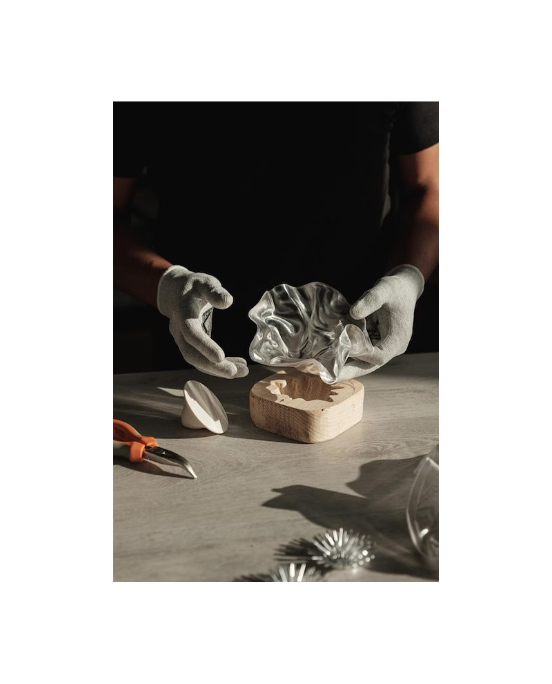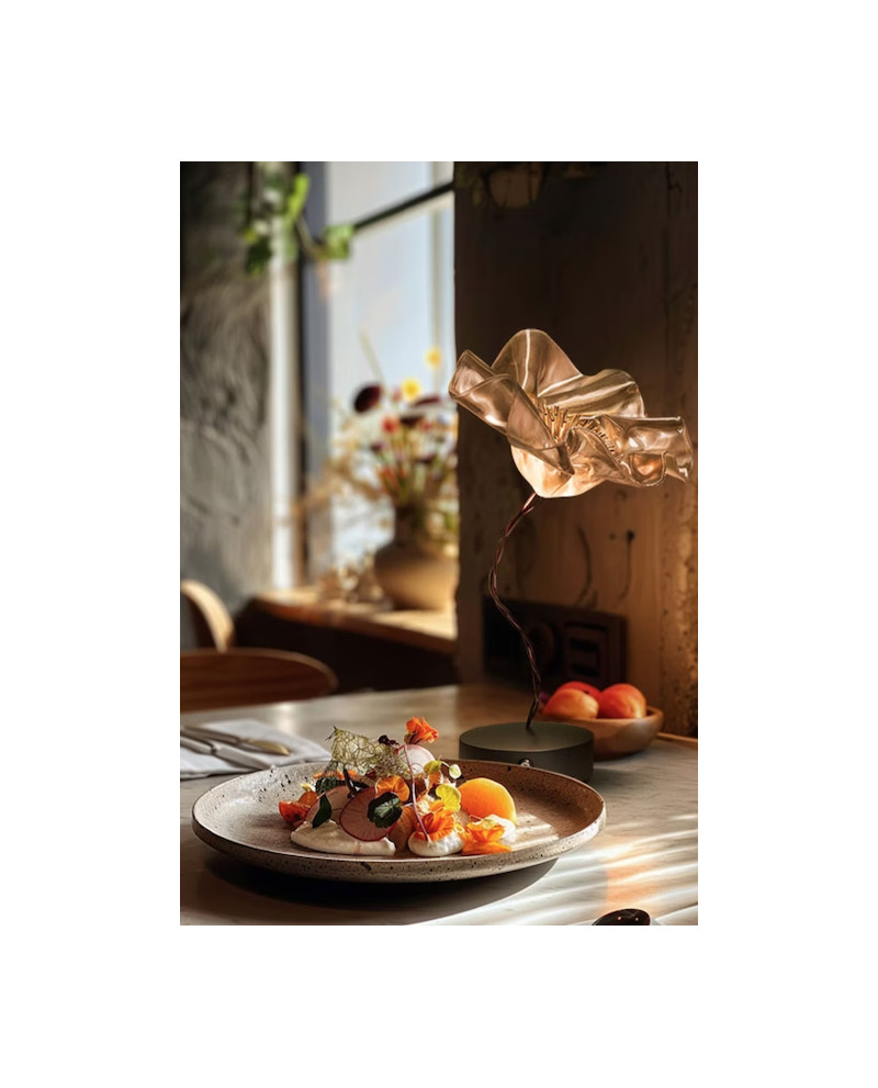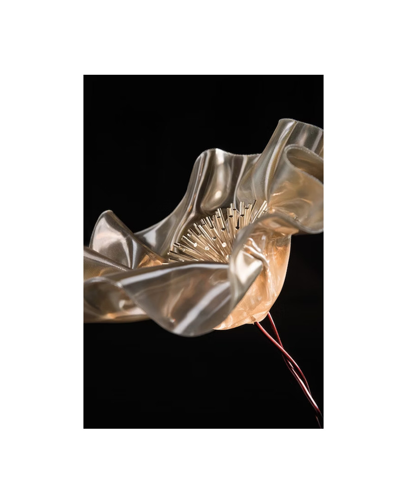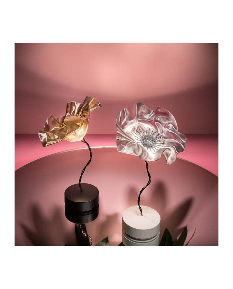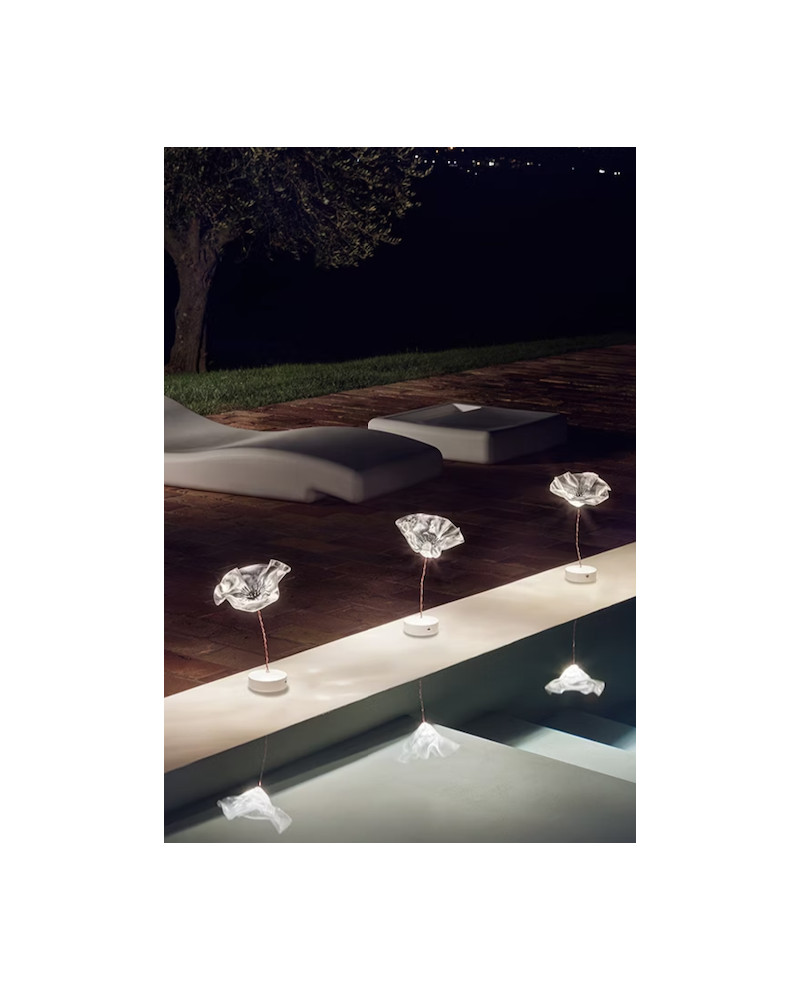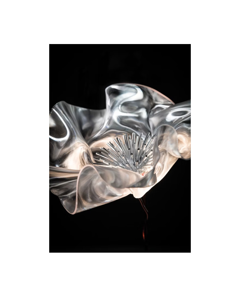 Marc Sadler a repoussé les limites des technopolymères exclusifs de Slamp, créant un nouveau langage de composition : la délicate LaFleur alimentée par batterie est une fleur moulée à la main, lentement sculptée à l'aide de Lentiflex à température contrôlée. Les versions prisme et velours ont une base magnétique mate, en blanc ou en noir, accompagnée d'un disque métallique qui ancre fermement la lampe sous les textiles pour un aménagement de table parfait. La batterie dure jusqu'à 60 heures et peut être rechargée à l'aide d'une station multiport adaptée à HO.RE.CA. Également disponible en applique.