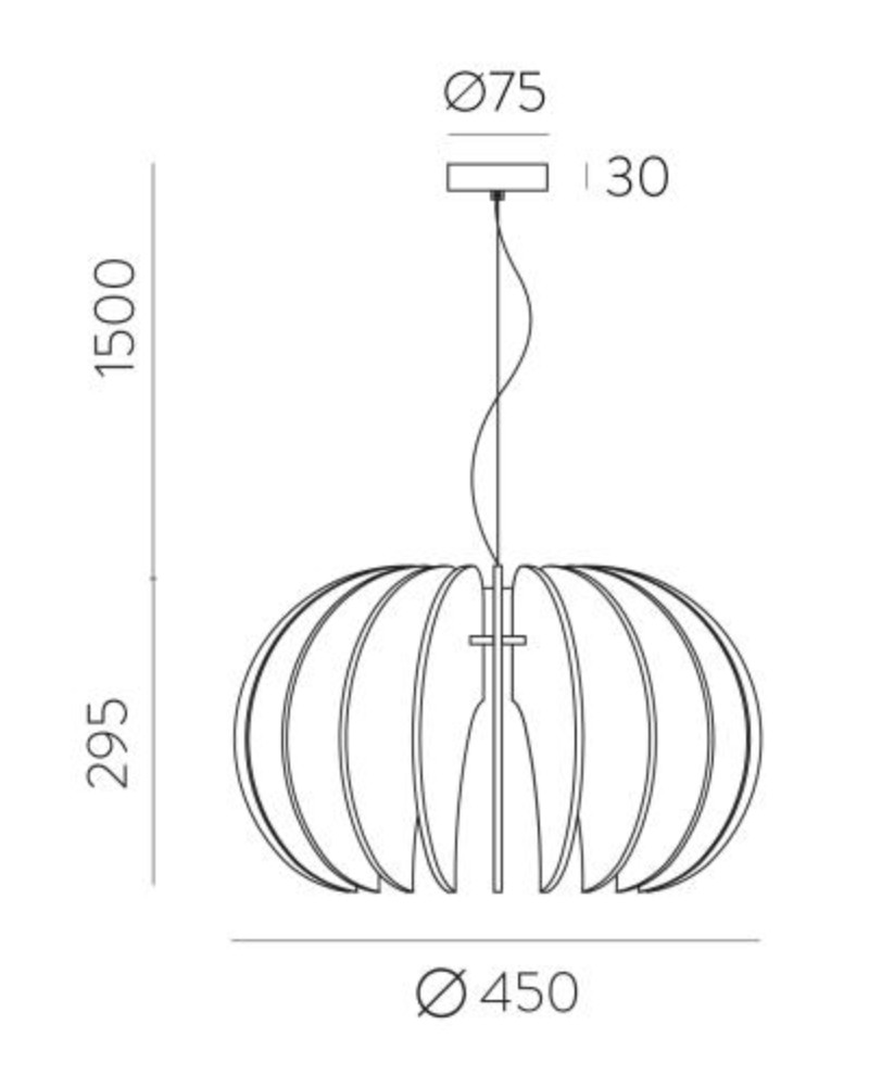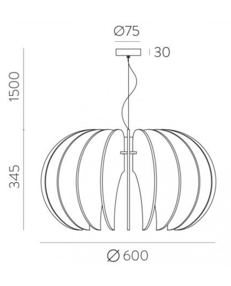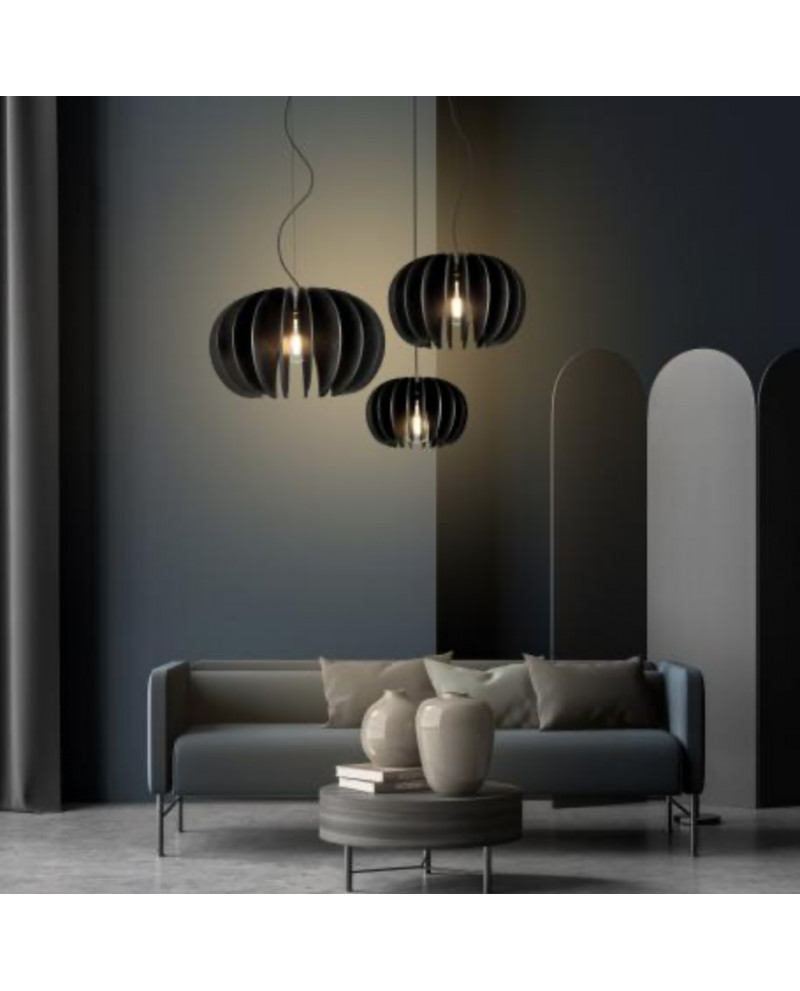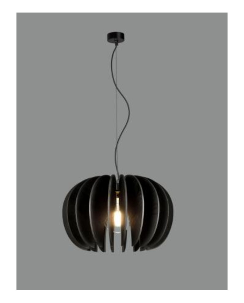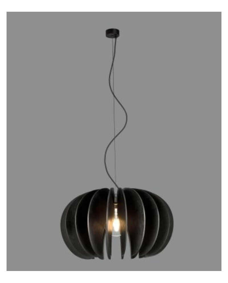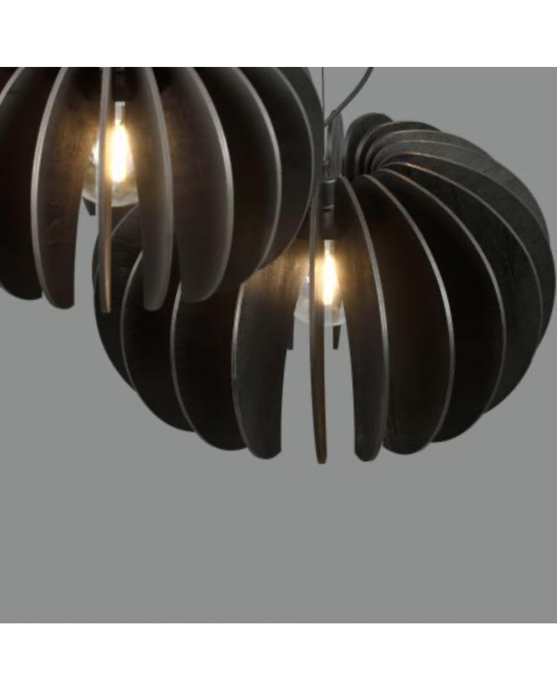 La structure de cette lampe, en bois noir , ressemble à la forme d'une fleur. La structure en pétale laisse passer la lumière, créant un beau jeu d'ombre et de lumière. La lumière est filtrée et crée un effet d'éclairage en spirale.