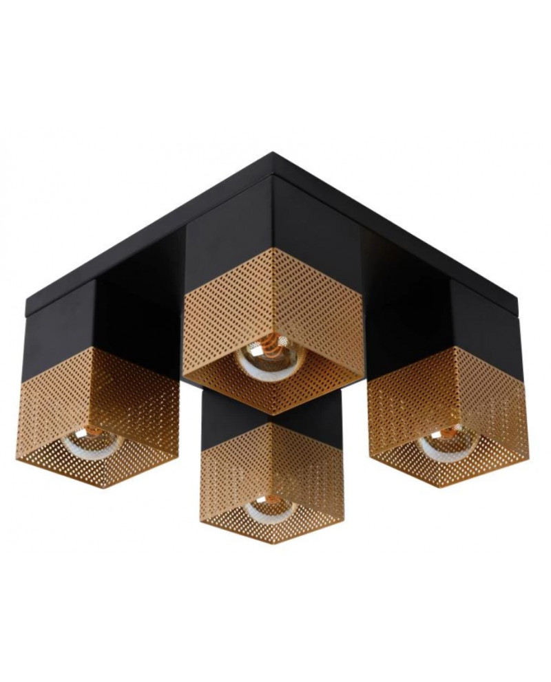 Tout seul, c'est bien, à plusieurs, c'est mieux, et personne ne veut être la cinquième roue du carrosse. Le plafonnier Renate l'a bien compris. La plaque de montage carrée est pourvue d'une ampoule dans chacun de ses coins, diffusant la lumière efficacement vers le bas. La base, contenant le socle de la lampe, a la finition noire sobre de la plaque de montage et les boîtiers des ampoules ont un look élégant et légèrement révélateur. Chaque lampe est cachée derrière quatre plaques de métal solides. Ces parois en laiton sont perforées pour un jeu de lumière ludique et dynamique. Et après la connexion à un gradateur de lumière, vous serez le maître de l'atmosphère dans la maison.