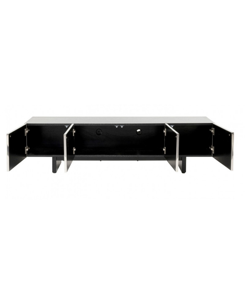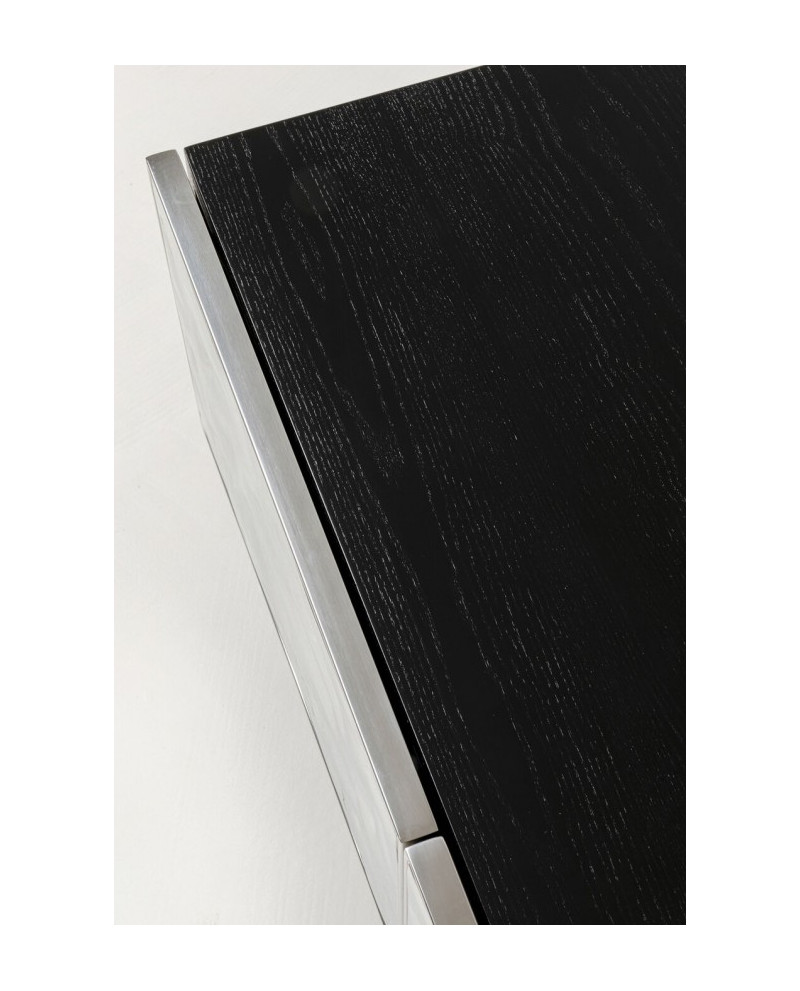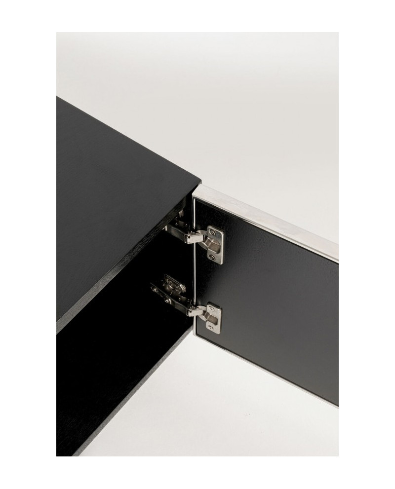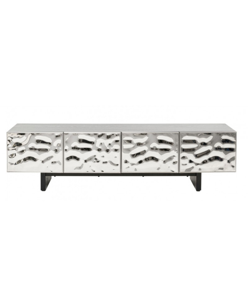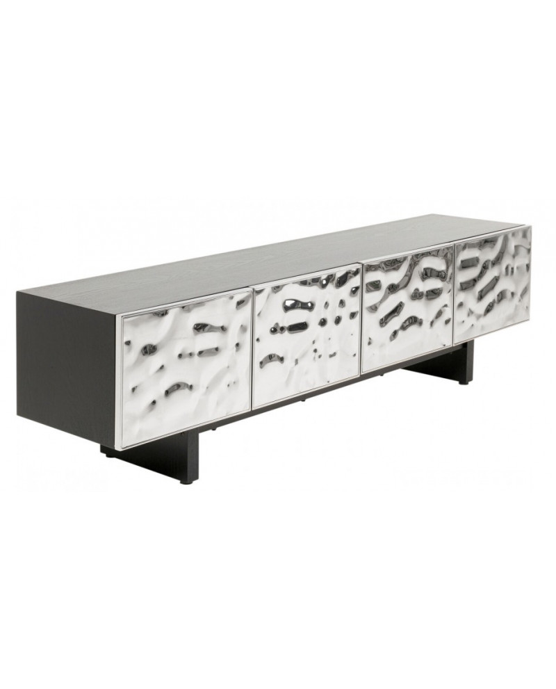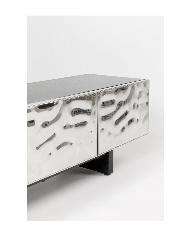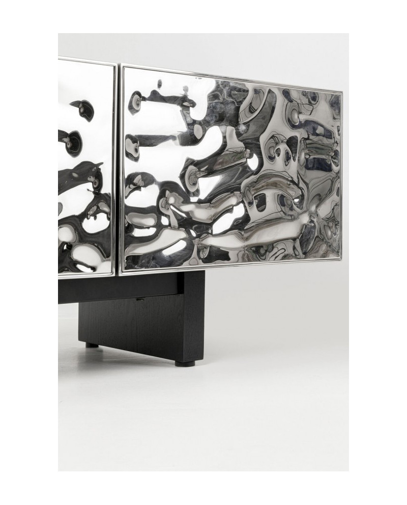 Ce buffet bas apporte une touche d'originalité avec ses façades argentées brillantes à l'aspect tridimensionnel. Le corps laqué noir et les pieds filigranes créent un contraste raffiné et une légèreté aérienne. Les portes sans poignée à ouverture par pression dissimulent un généreux espace de rangement pour la vaisselle, les accessoires de maison ou les appareils électroniques. Qu'il s'agisse d'une élégante console multimédia dans le salon ou d'un buffet extravagant, cette pièce maîtresse s'intègre parfaitement aux intérieurs modernes, minimalistes ou luxueux et s'harmonise particulièrement bien avec le verre, le métal et les textiles veloutés.