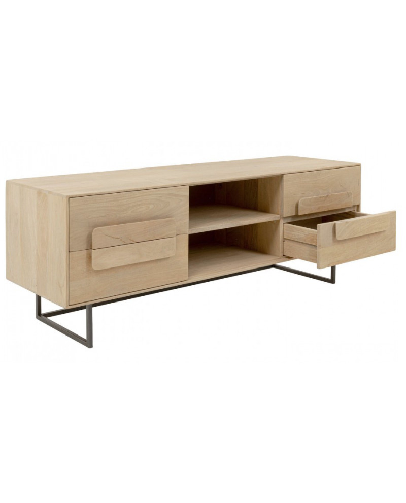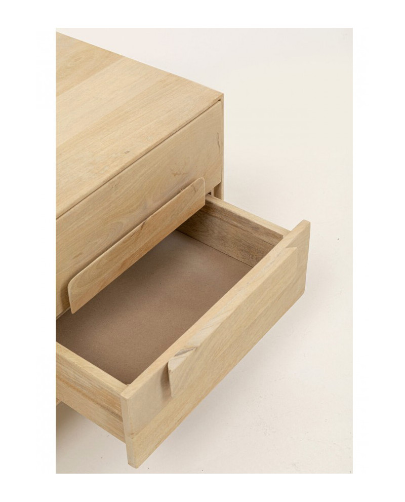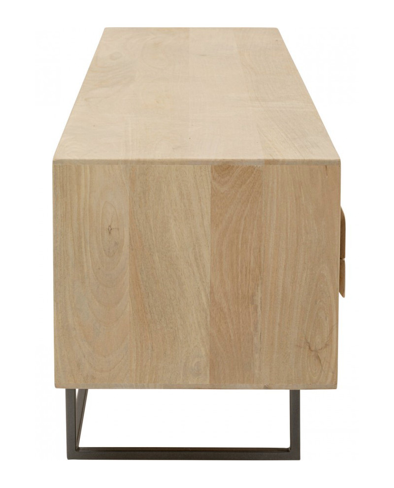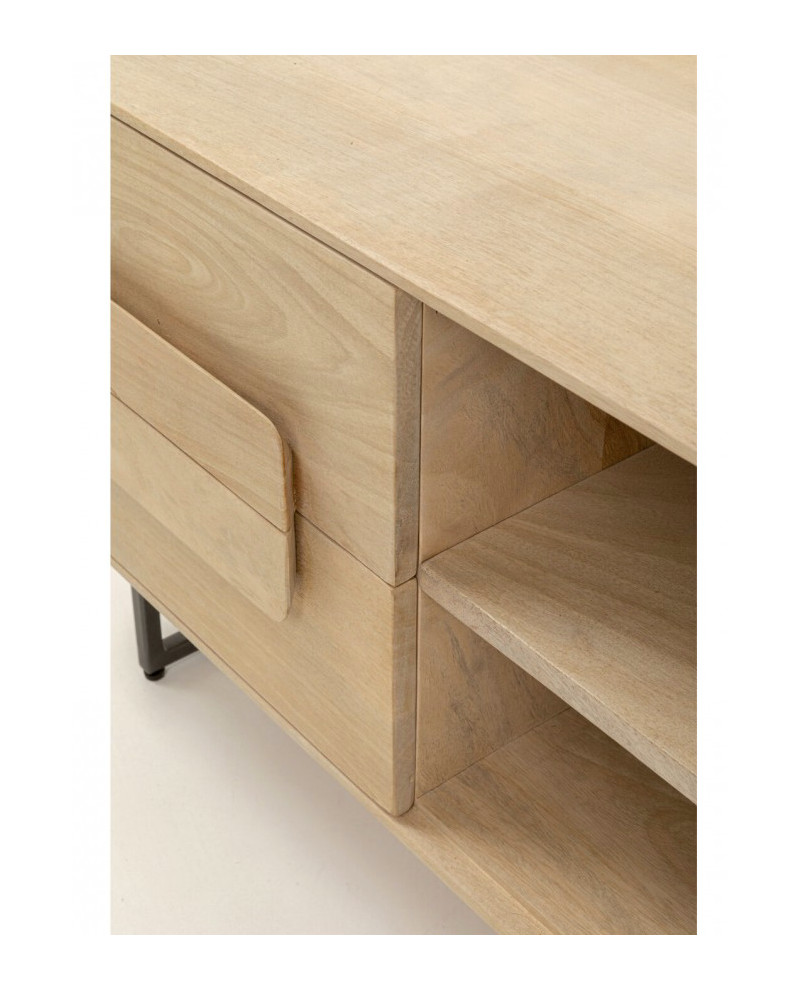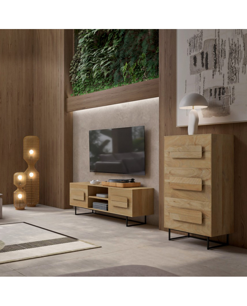 La gamme Mulino se distingue par sa finition claire et naturelle, qui met en valeur l'aspect naturel du manguier. La surface laquée douce accentue le veinage du bois et crée un style moderne et aérien. La structure frontale en relief apporte une touche artistique, tandis que les pieds en acier filigrané créent un mélange de matériaux captivant. Outre son esthétique, elle offre un espace de rangement pratique et élégant, idéal pour un intérieur ordonné et design. Idéale pour les styles d'intérieur scandinaves, minimalistes ou bohèmes, elle s'harmonise avec des tons naturels doux, des touches de noir contrastées ou des touches métalliques pour une ambiance élégante et chaleureuse.