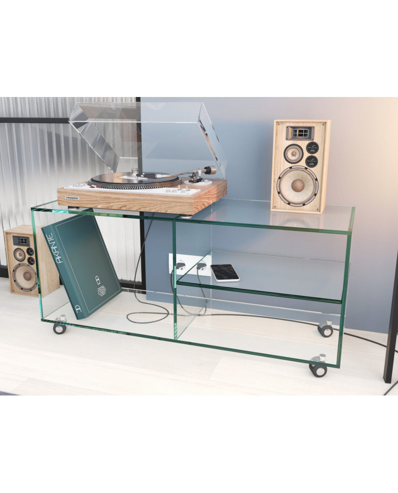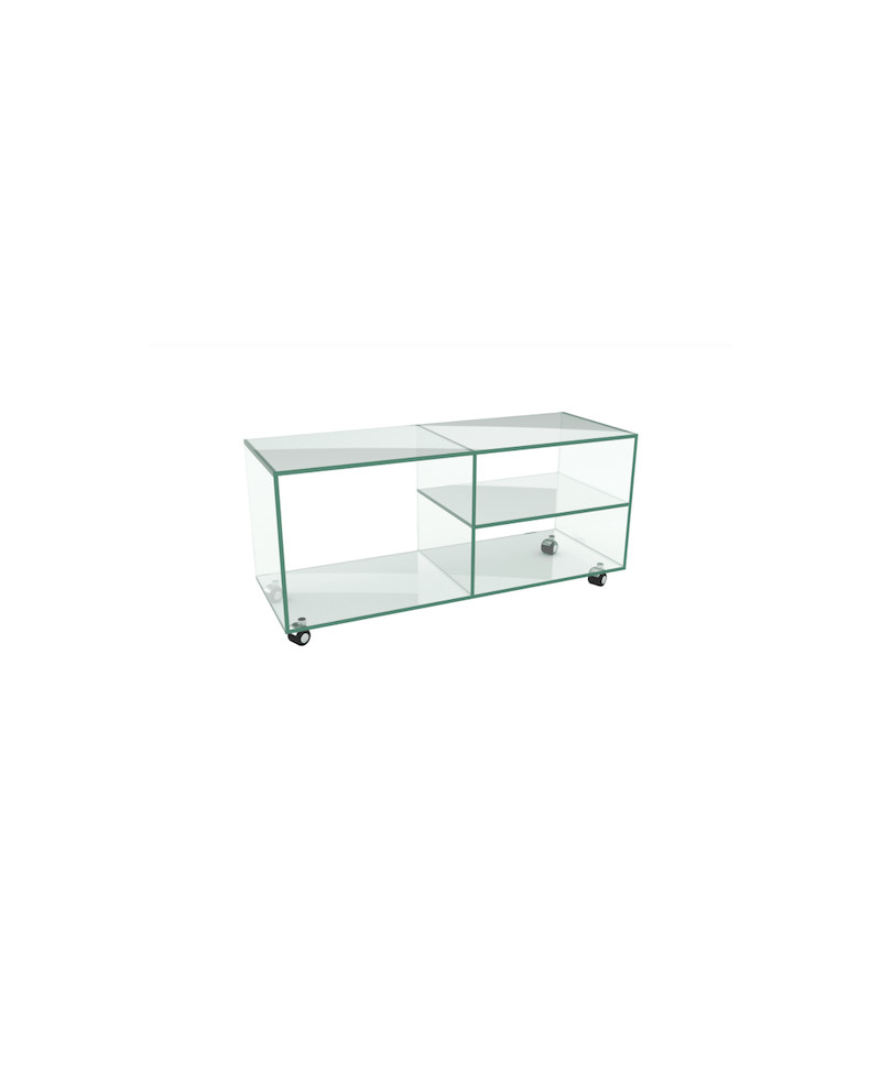 LETO est un meuble TV de petite dimension. A roulette, vous pouvez déplacer LETO comme vous le souhaitez. Le meuble TV LETO est fabriqué en Europe occidentale. Il s’agit d’un assemblage minimaliste de verre collé d’une épaisseur de 10mm.