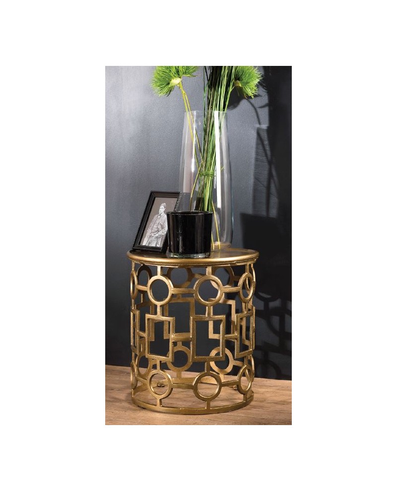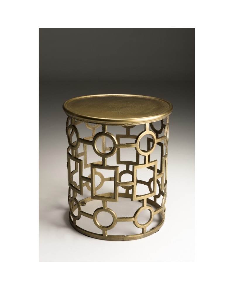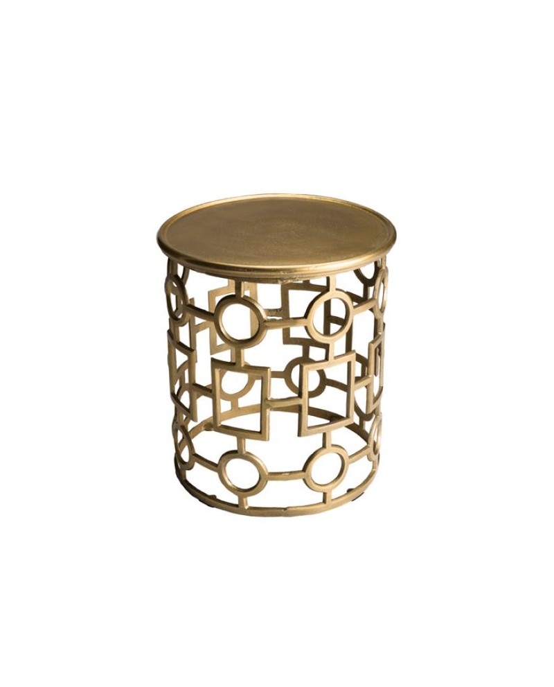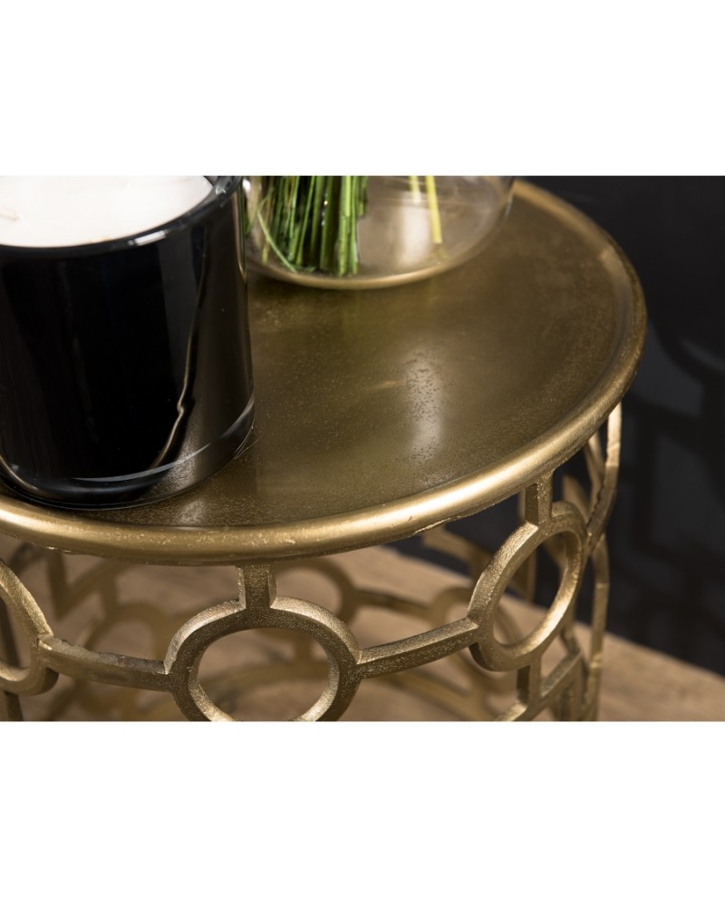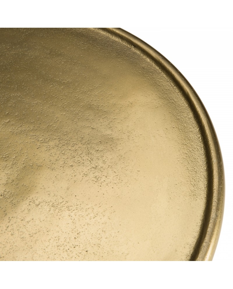 Table d'appoint ronde en aluminium doré, piètement graphique.