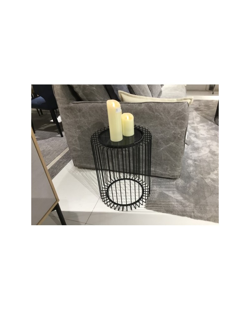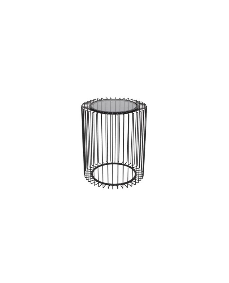 Table d'appoint forme cylindre métal noir filaire design géométrique, plateau verre fumé.