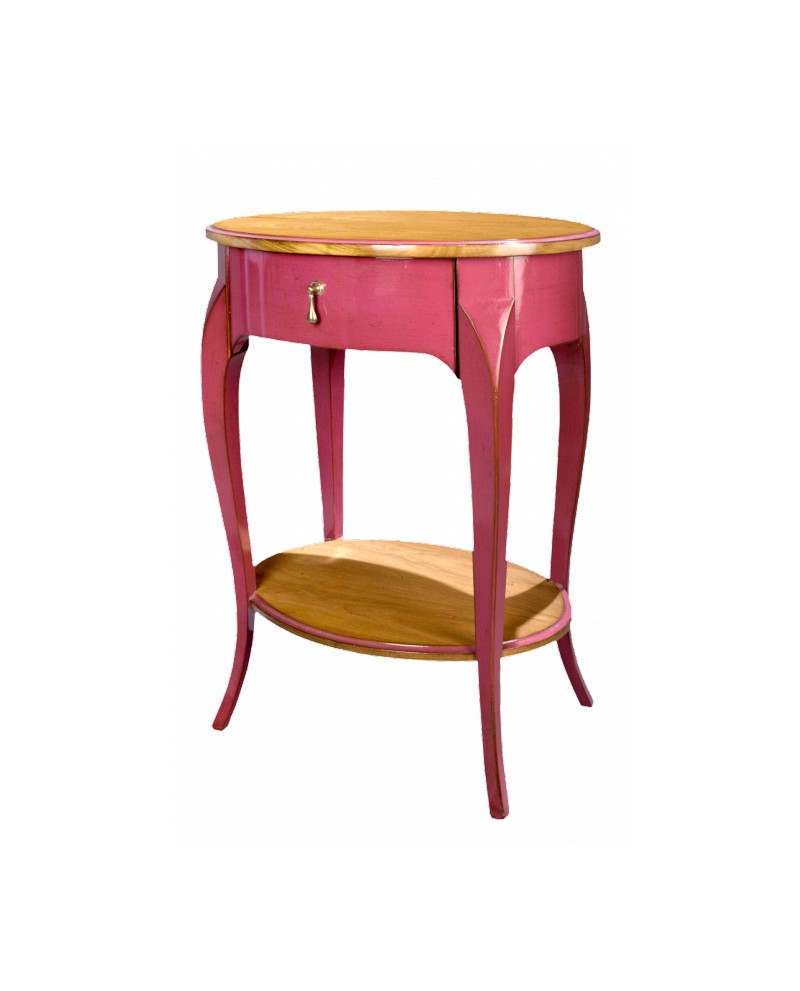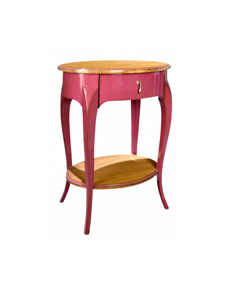 Guéridon ovale 1 tiroir, pieds galbés. Bois merisier massif et tilleul pour les parties laquées. Structure laquée framboise, plateaux merisier délavés patiné 1/2 antiquaire.