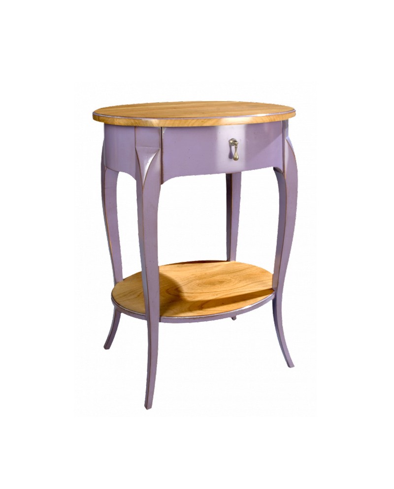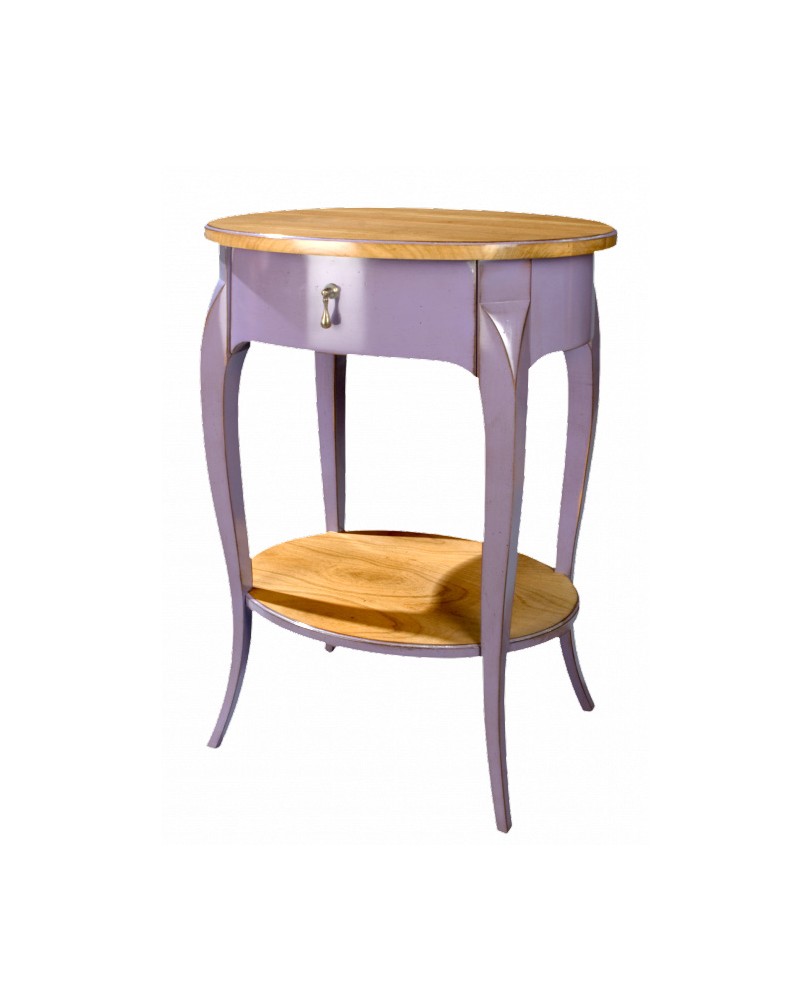 Guéridon ovale 1 tiroir, pieds galbés. Bois merisier massif et tilleul pour les parties laquées. Structure laquée purple, plateaux merisier délavés patiné 1/2 antiquaire.