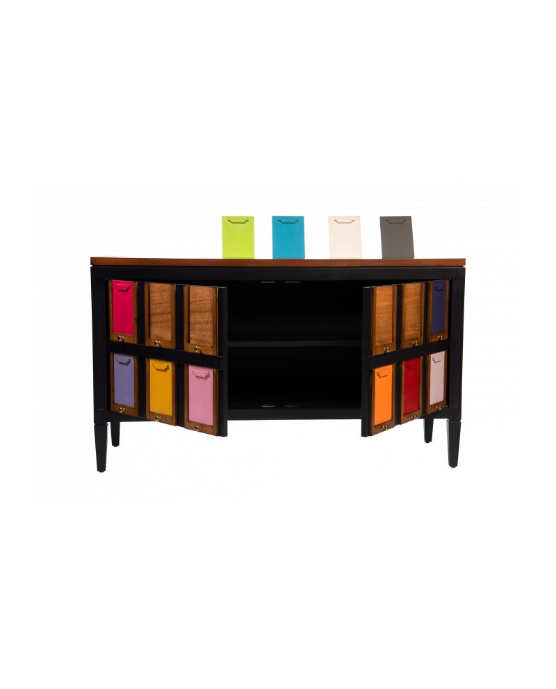 Meuble d'entrée large 2 portes, 1 étagère fixe, bois merisier massif et hêtre. Structure laqué noir, décor portes photos laque multi-couleurs, plateau merisier délavé.