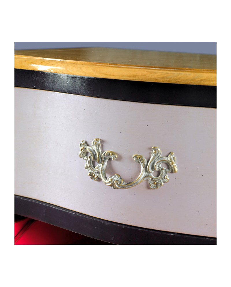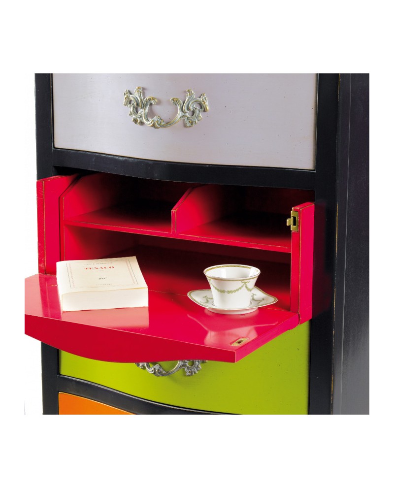 Secrétaire 3 tiroirs, 1 abattant avec casier de rangement. Plateau merisier délavé et tilleul pour les parties laquées. Structure laque noire, décor tiroirs laque multi couleur patiné 1/2 antiquaire. Ferronnerie laiton patiné.