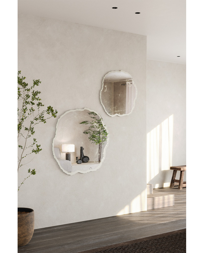 Arbo affiche résistance et délicatesse à la fois : un arbre solide sur la surface fragile d’un miroir. Cette forme et impression naturelles donnent à ce miroir une apparence chaleureuse et conviviale. Sur le mur, il reflète l’environnement avec douceur, entrelacé dans le dessin des cernes de croissance de l’arbre. Faites entrer la nature chez vous.