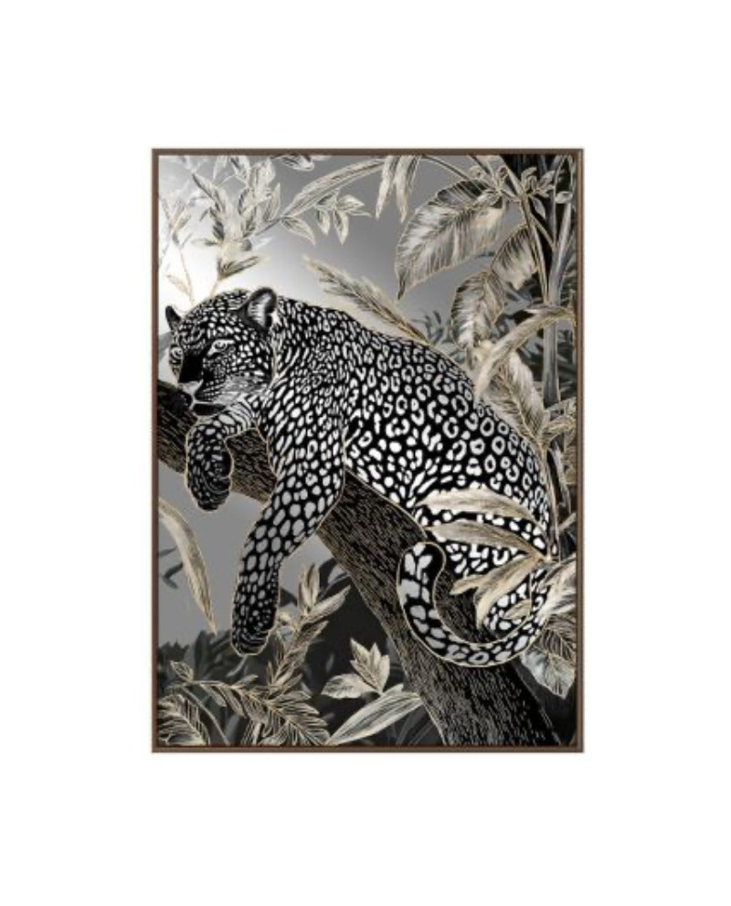 Miroir décoratif reprenant le tableau d’une panthère noire majestueuse couchée sur une branche au cœur de la jungle. Ses tons profonds et naturels plongent instantanément dans une ambiance sauvage et mystérieuse. En plus d’agrandir visuellement la pièce et d’apporter lumière et profondeur, ce miroir crée une immersion unique, donnant la sensation d’être transporté directement au cœur de ce décor intense et captivant.