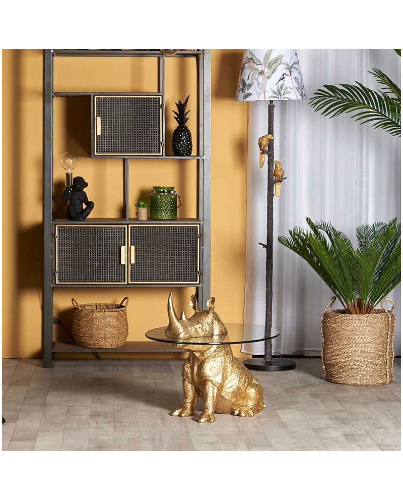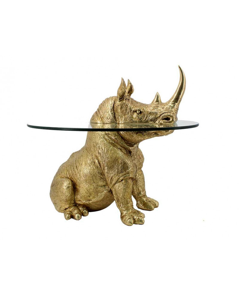 Magnifique table d'appoint rhinocéros en polyrésine finition dorée et plateau verre ovale.