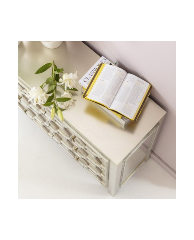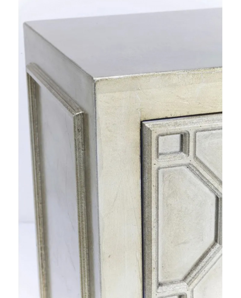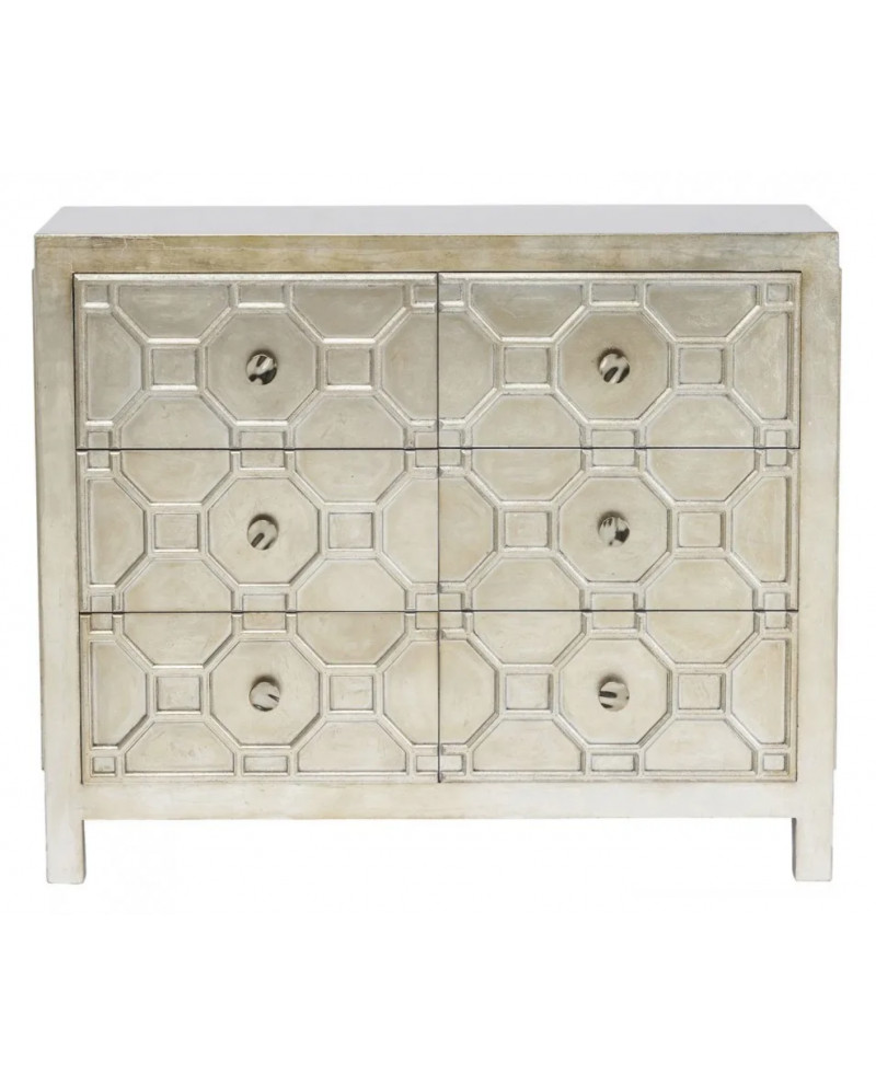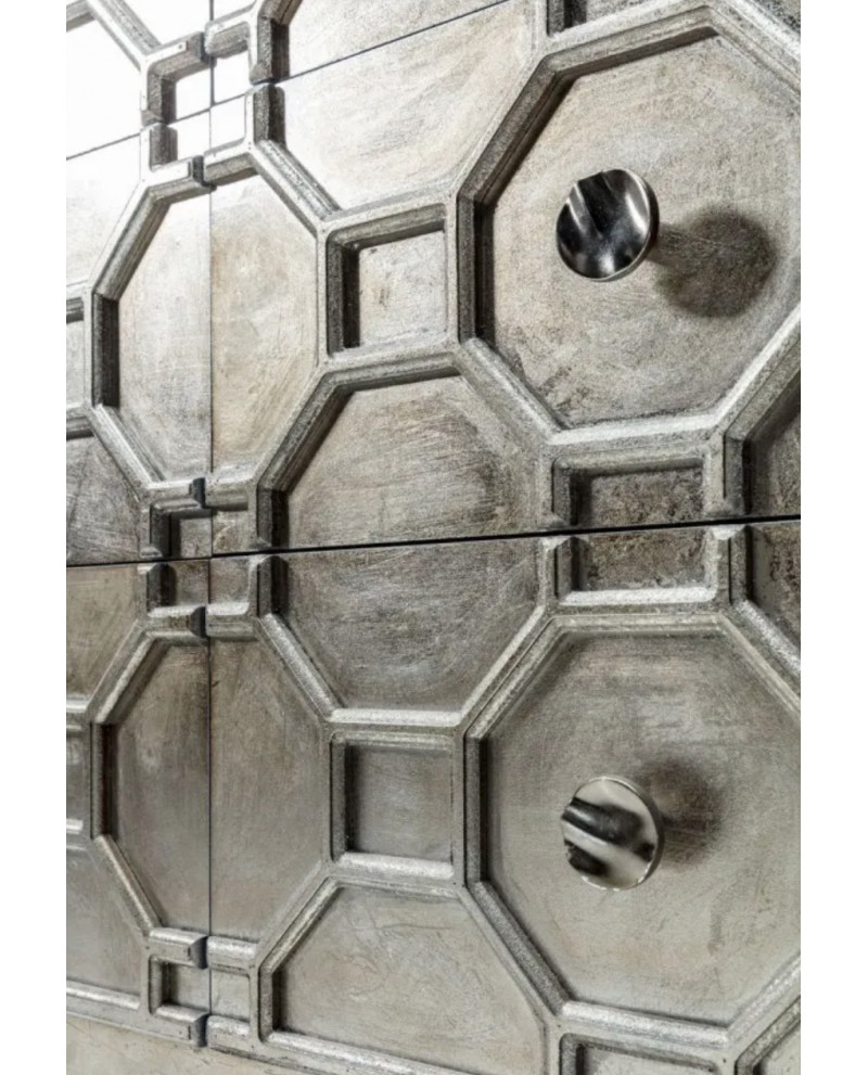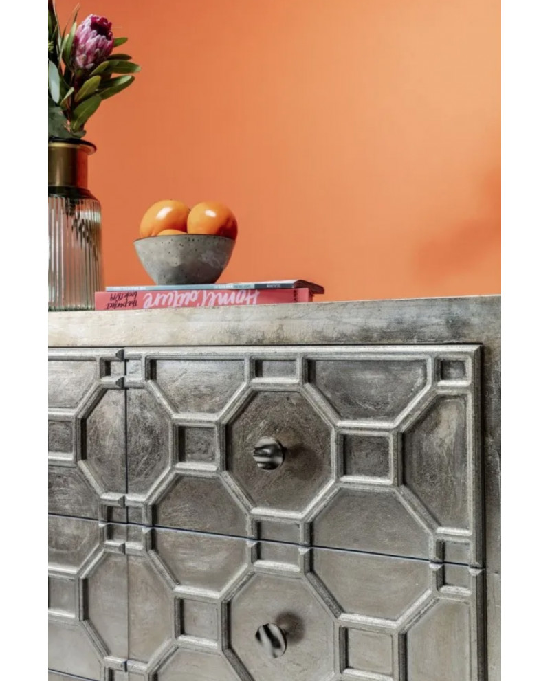 Cette commode a été conçue pour rappeler l'architecture présente au Moyen-Orient. Ses motifs évoquent les mosaïques colorées et les petites ruelles pleines de charme. Son coloris champagne va vous transporter dans un palace entouré de palmiers et de sable. Sa finition métallique effet brut complète son design.
