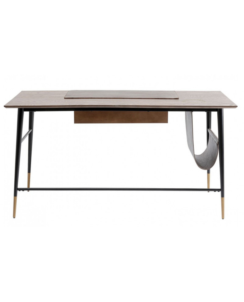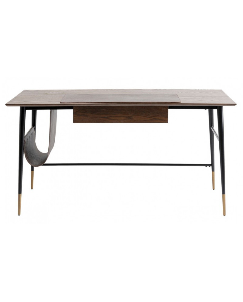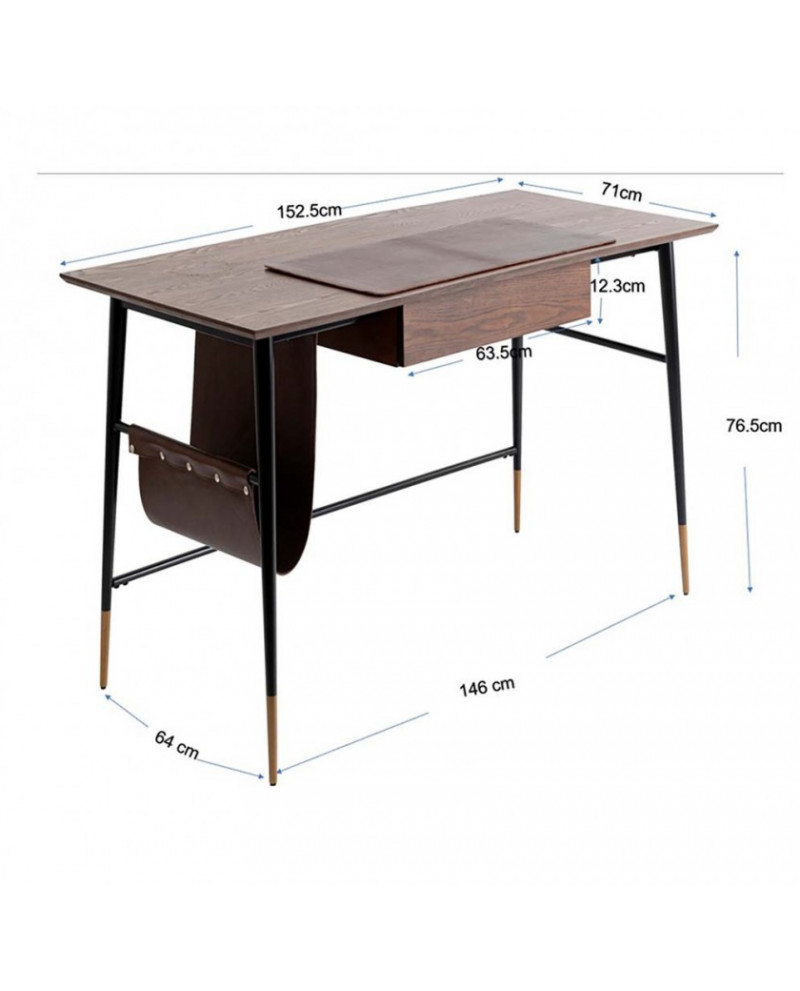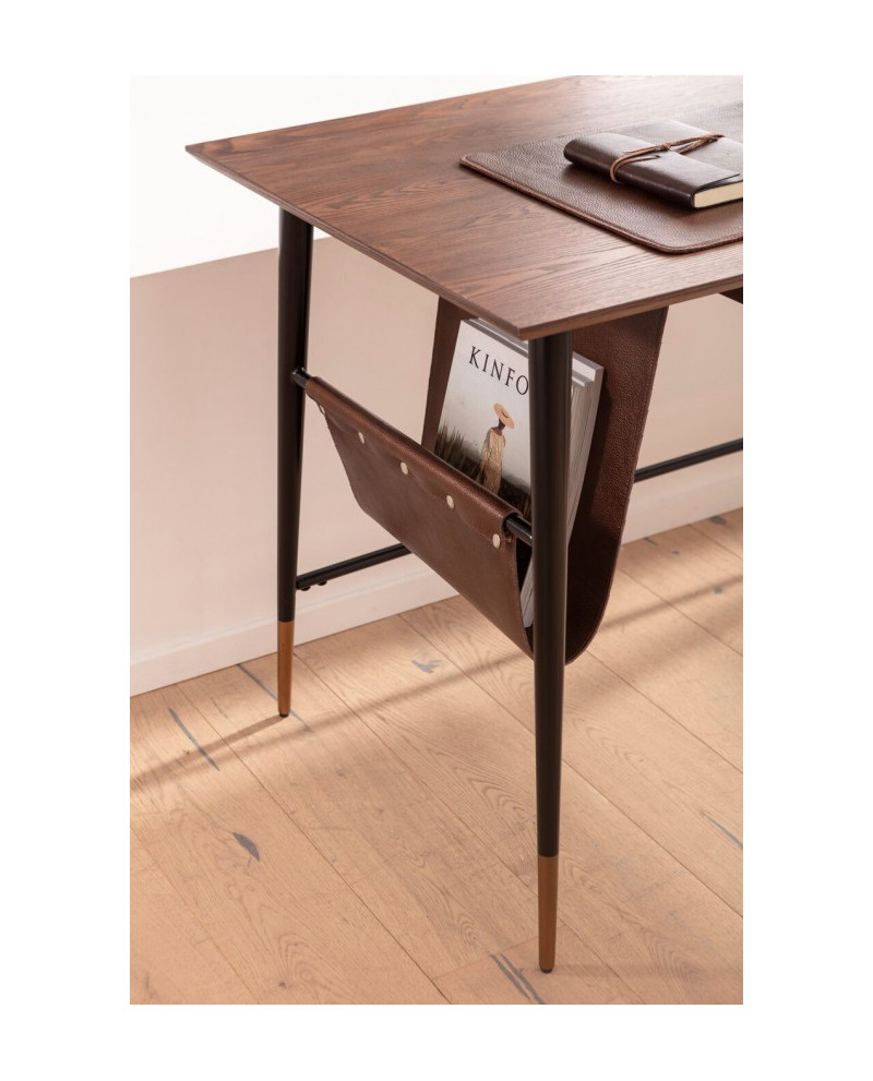 Ce bureau présente une combinaison harmonieuse d'un piétement en acier et d'un plateau en bois compressé sombre avec un dessous de main intégré en cuir. De style vintage, il est équipé d'un tiroir pour ranger vos fournitures et d'un hamac en cuir à journaux.