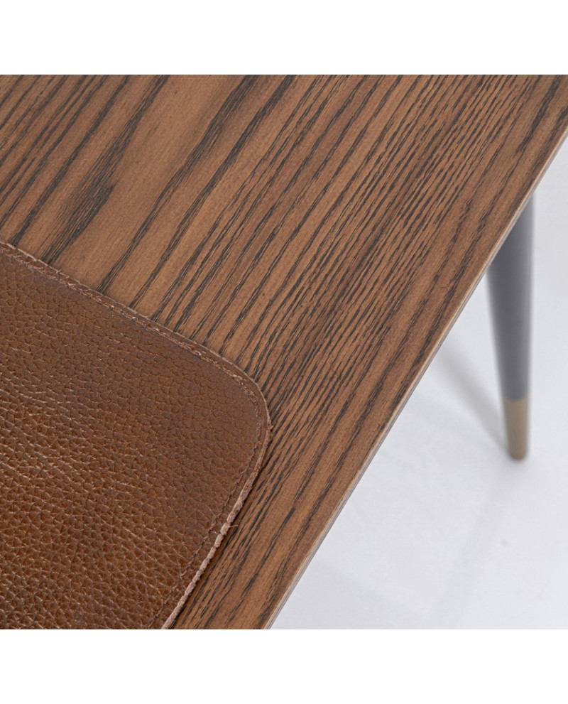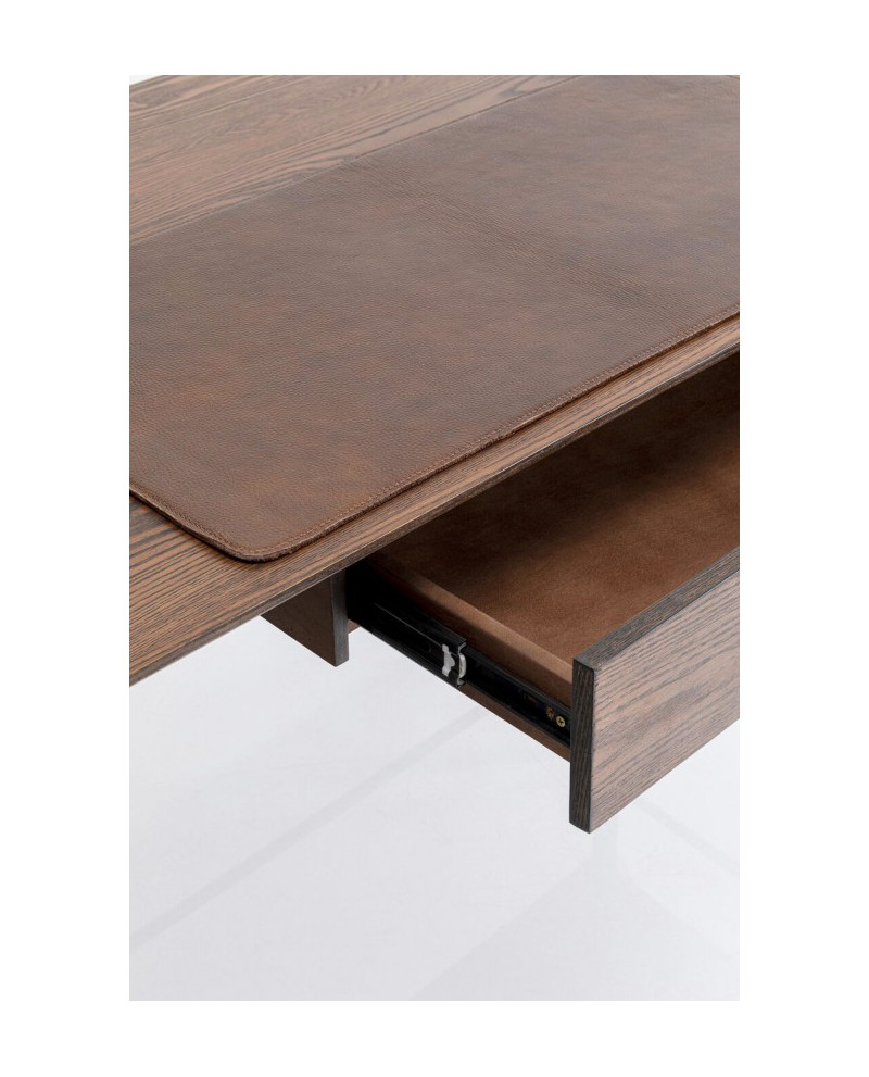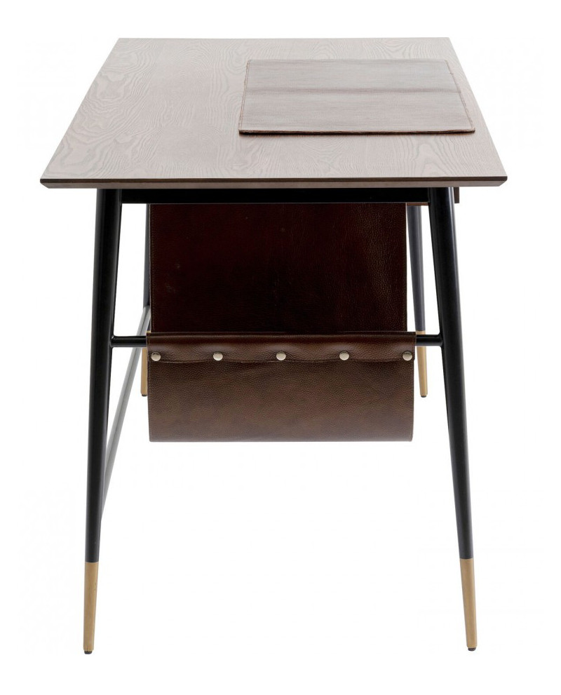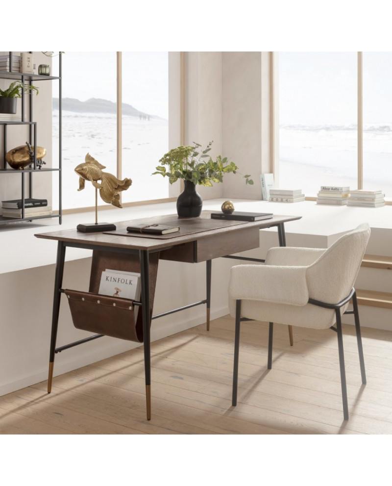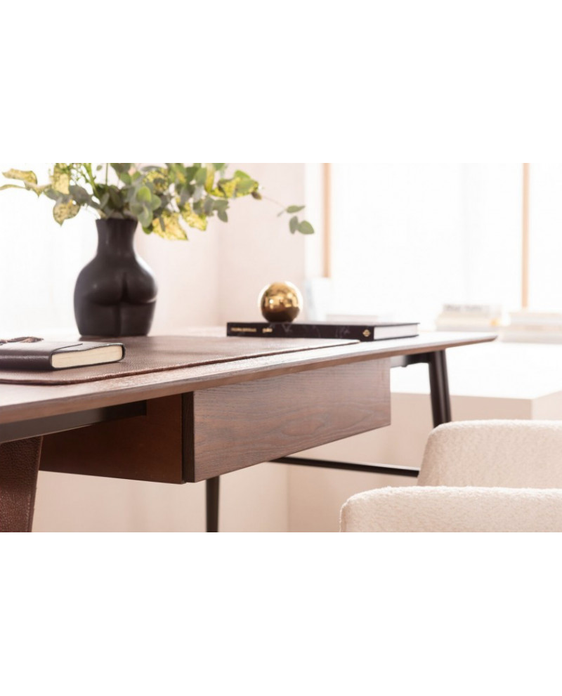 Ce bureau présente une combinaison harmonieuse d'un piétement en acier et d'un plateau en bois compressé sombre avec un dessous de main intégré en cuir. De style vintage, il est équipé d'un tiroir pour ranger vos fournitures et d'un hamac en cuir à journaux.