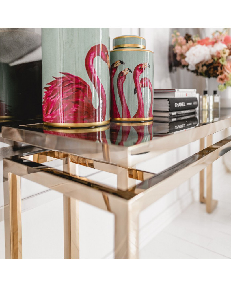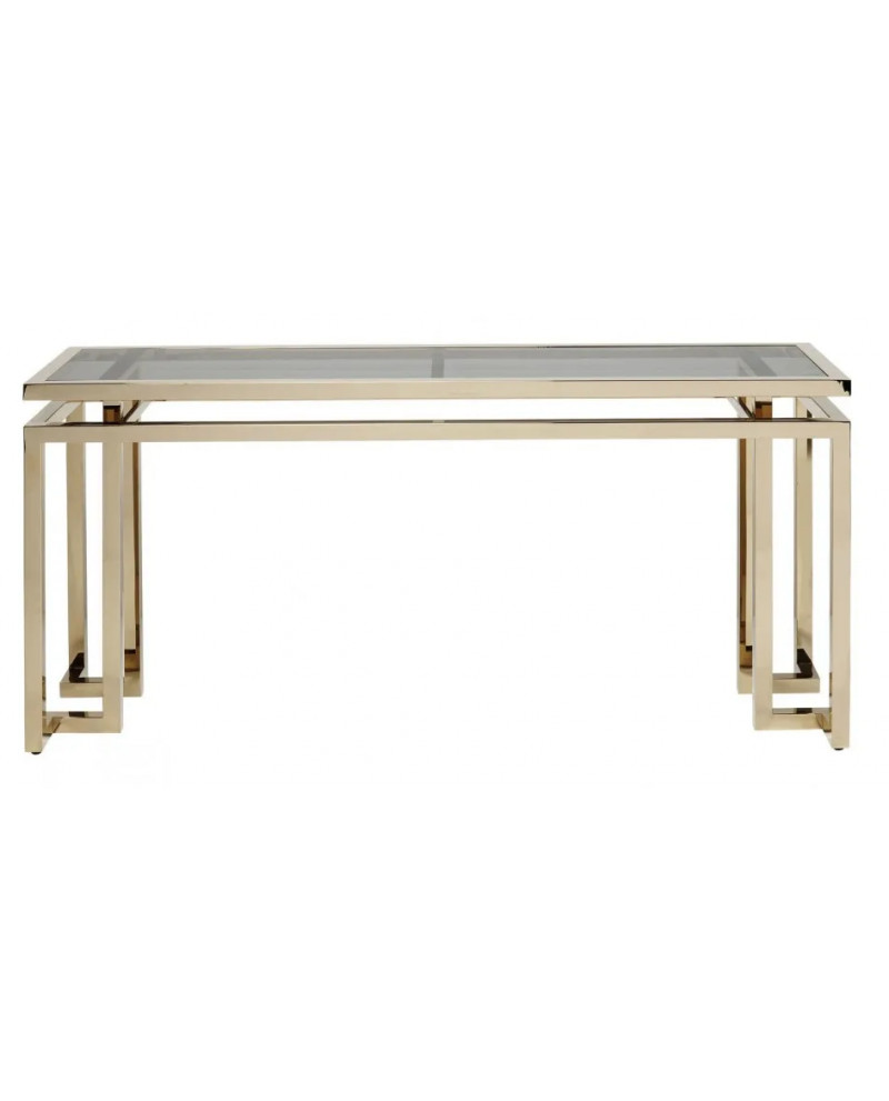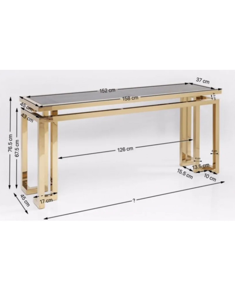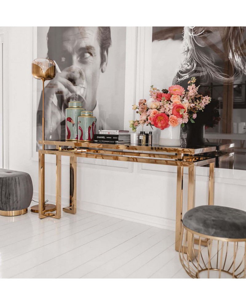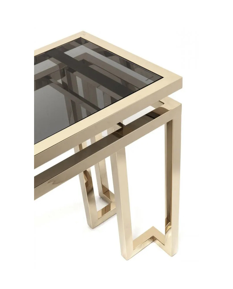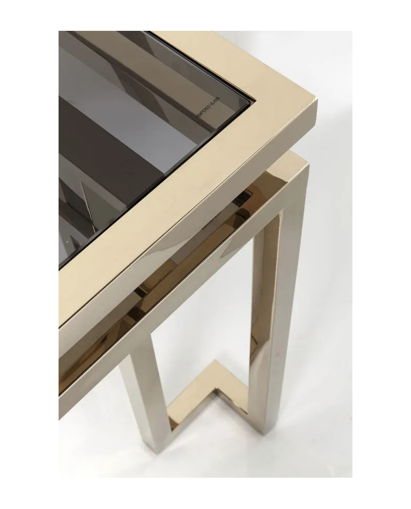 Cette table au piètement géométrique vous révélera tout son potentiel une fois placée dans un intérieur élégant et moderne. Avec son plateau en verre trempé teinté de 8 mm d'épaisseur et sa structure dorée en acier inoxydable, cette table change votre séjour en un palace.