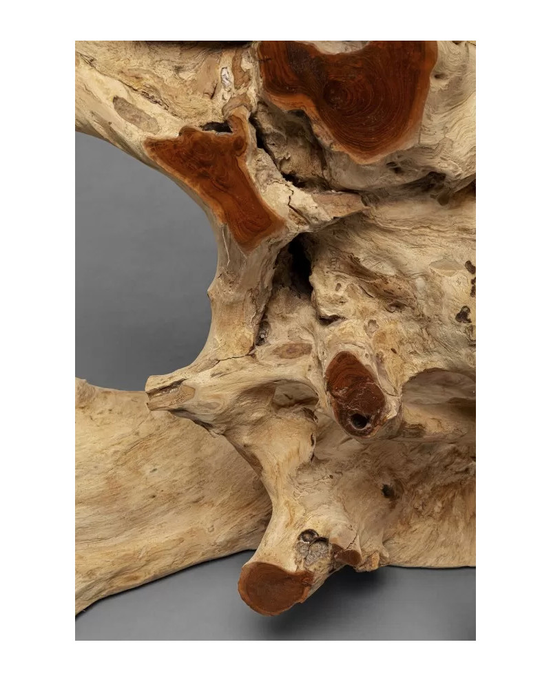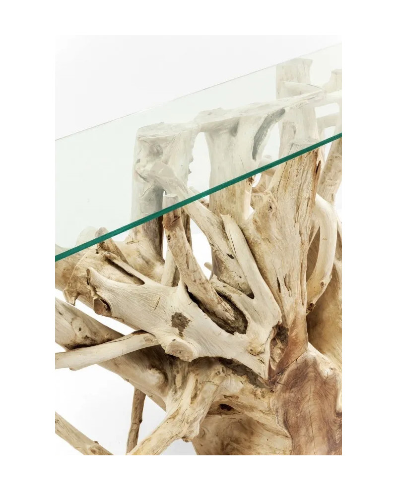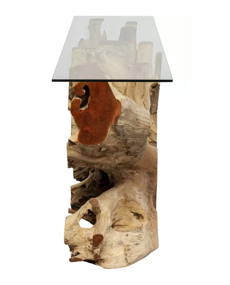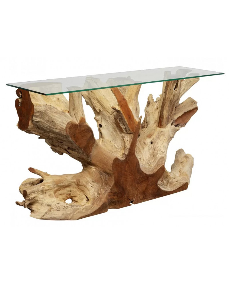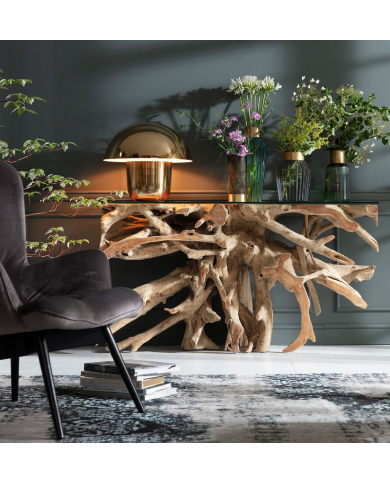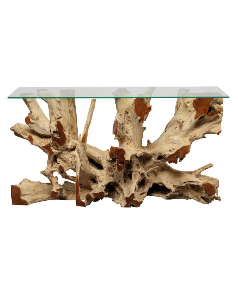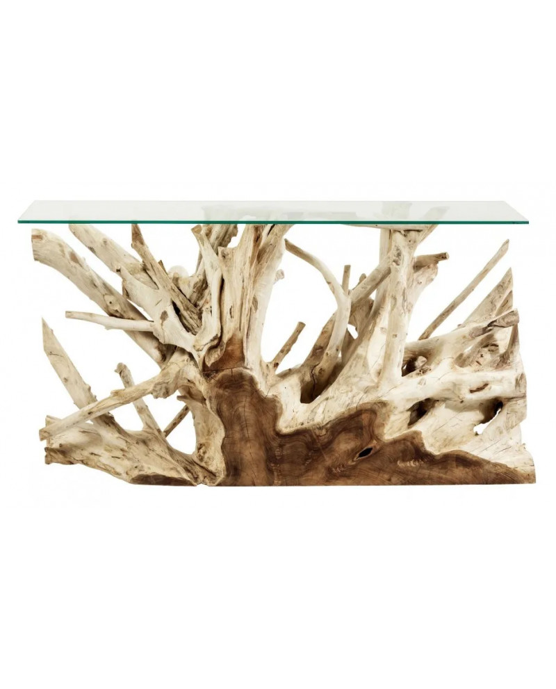 Console livrée avec le plateau en verre 10 mm à poser sur les pieds. Le socle en bois de teck diffère selon chaque modèle. Chaque pièce de ce meuble est ainsi unique.