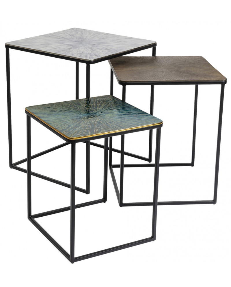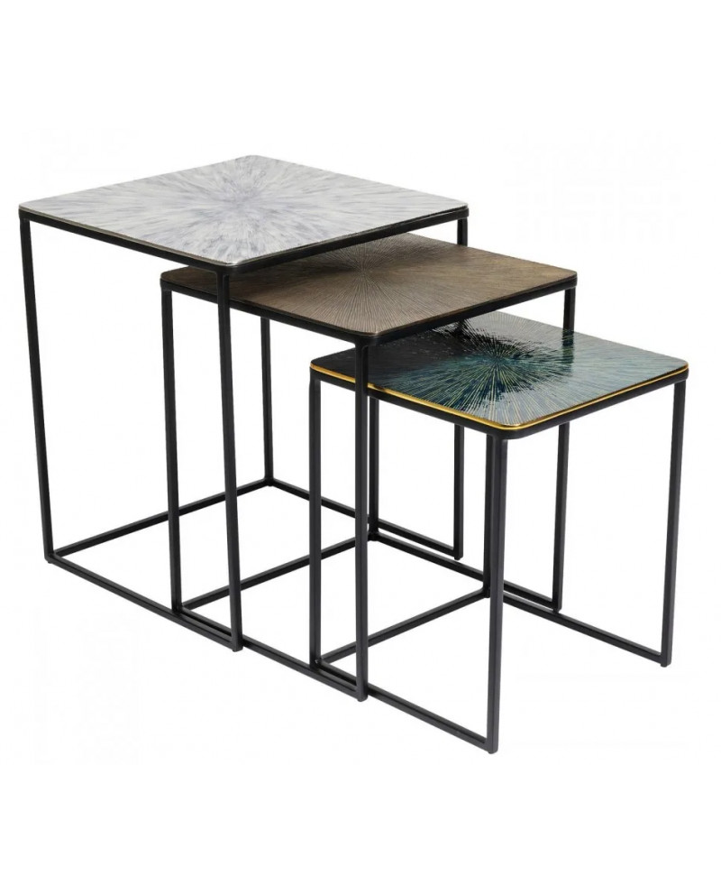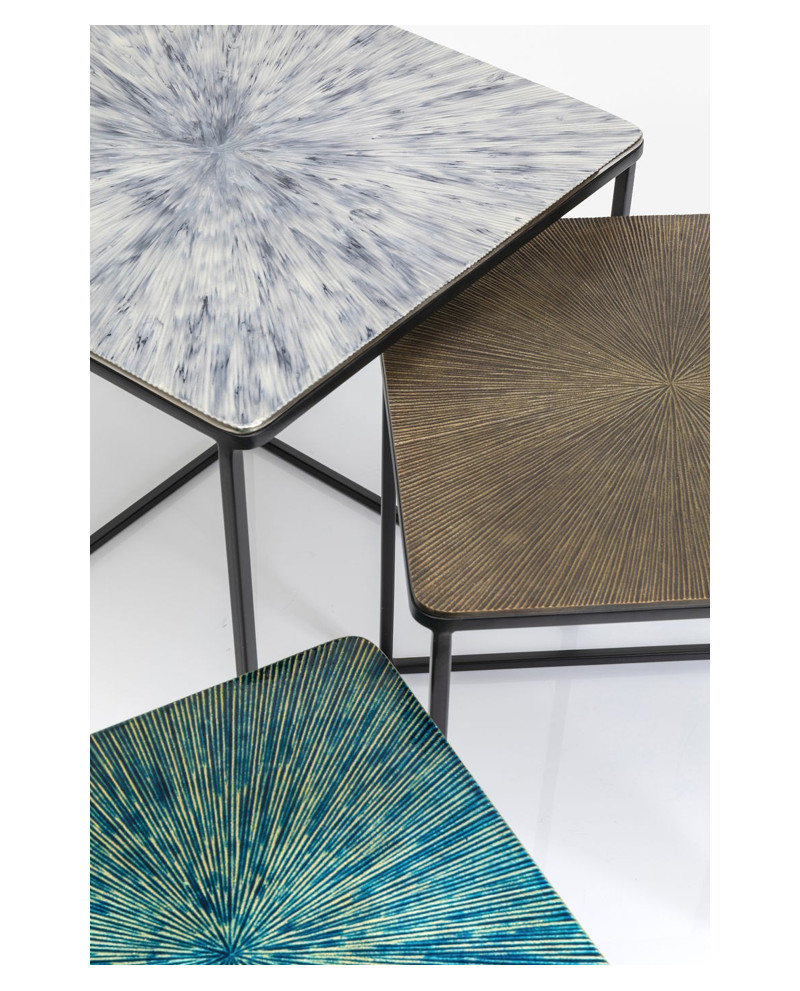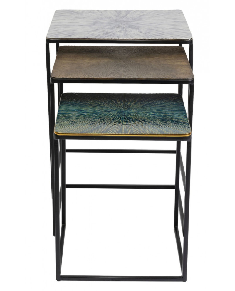 Distinguez-vous en adoptant ce set de 3 tables d’appoints carrées gigognes qui relèvent d’un style contemporain. Leur piétement minimaliste en acier poudré met en lumière les plateaux en aluminium aux motifs en rayons avec des couleurs hétérogènes pour plus d’originalité. Elles peuvent se placer ensemble et se ranger les unes sous les autres ou être séparées dans des pièces différentes.