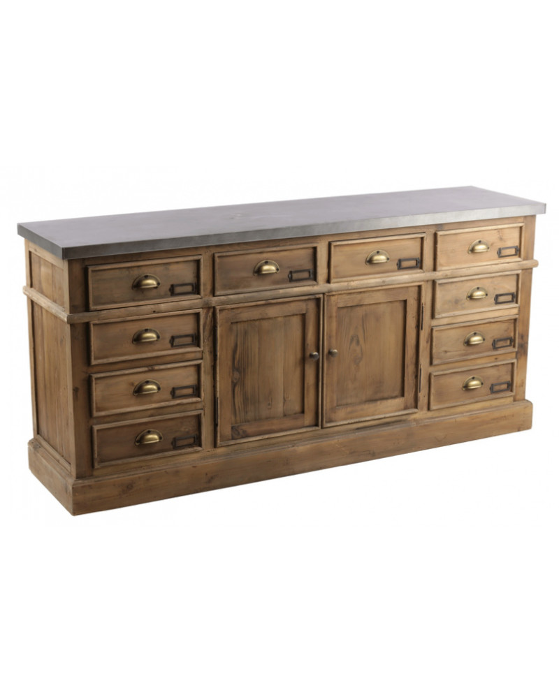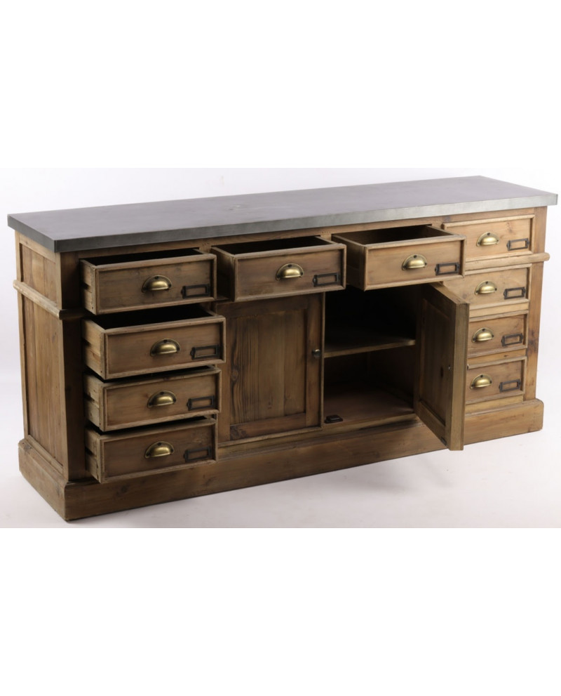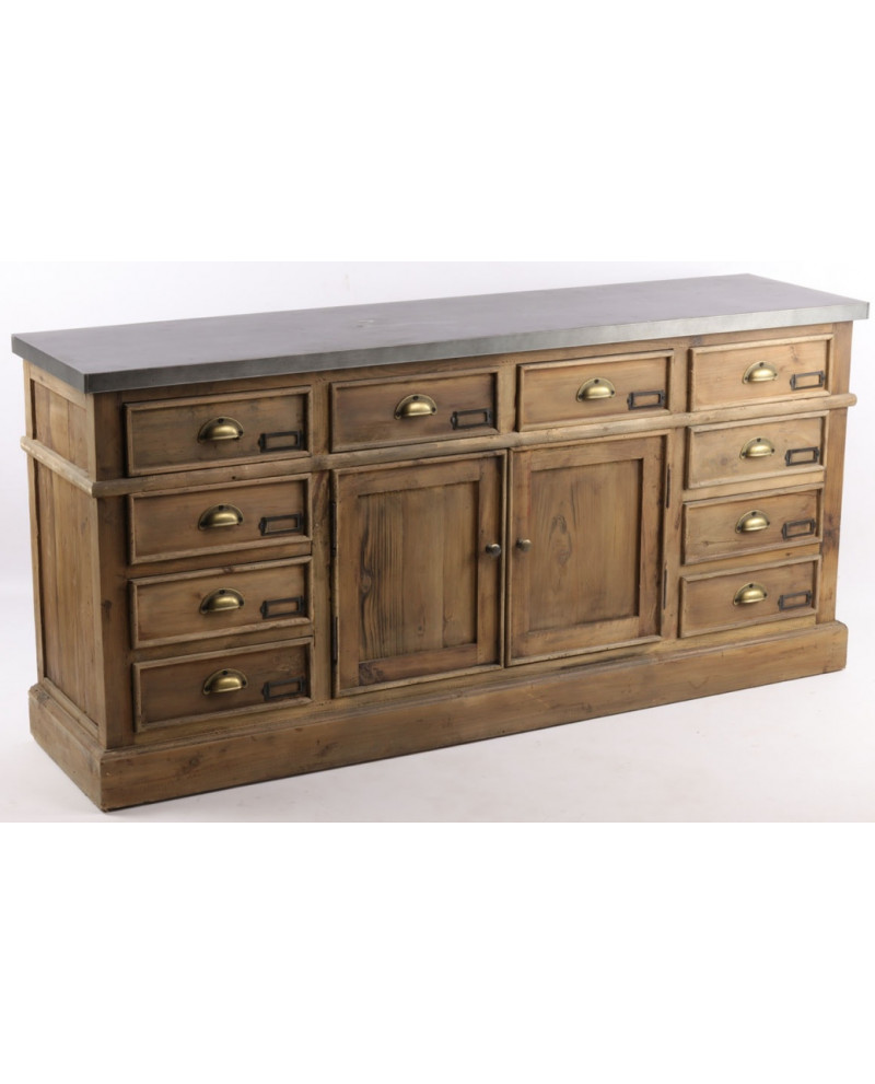 L'enfilade de métier, fabriquée en bois de pin recyclé, est un meuble de 160 cm parfait pour un intérieur au style vintage ou industriel. Avec ses 10 tiroirs, elle offre une capacité de rangement importante tout en ajoutant du charme avec son bois vieilli et ses irrégularités naturelles. Chaque pièce est unique, témoignant des traces de vies antérieures du matériau, ce qui renforce son authenticité et son caractère. Dimensions : H76 x L160 x P40 cm.