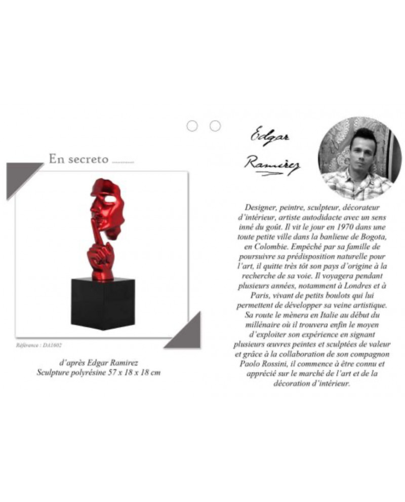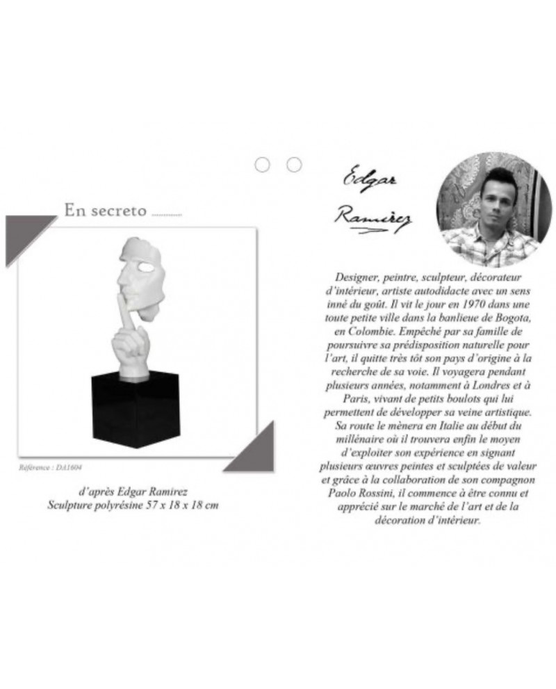 Sculpture d’après Edgar Ramirez, designer, peintre, sculpteur, décorateur d’intérieur, artiste autodidacte avec un sens inné du goût. Il vit le jour en 1970 dans une toute petite ville dans la banlieue de Bogota, en Colombie. Empêché par sa famille de poursuivre sa prédisposition naturelle pour l’art, il quitte très tôt son pays d’origine à la recherche de sa voie. Il voyagera pendant plusieurs années, notamment à Londres et à Paris, vivant de petits boulots qui lui permettent de développer sa veine artistique. Sa route le mènera en Italie au début du millénaire où il trouvera enfin le moyen d’exploiter son expérience en signant plusieurs œuvres peintes et sculptées de valeur et grâce à la collaboration de son compagnon Paolo Rossini, il commence à être connu et apprécié sur le marché de l’art et de la décoration d’intérieur.