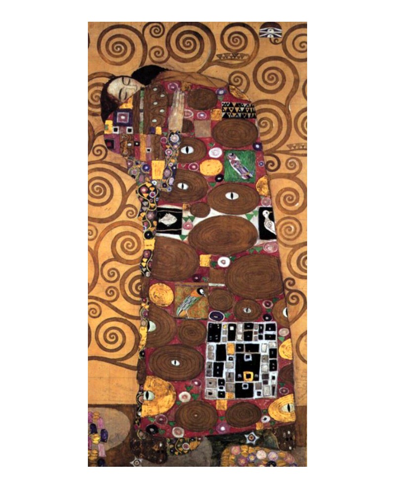Le couple d'amoureux tourne le dos au monde, se cachant dans une étreinte figée derrière les bienfaits des ornements de l'Art nouveau. Ce motif fait partie d'un sujet décoratif d'une mosaïque sur la frise de la salle des festins du Palais Stoclet à Bruxelles.