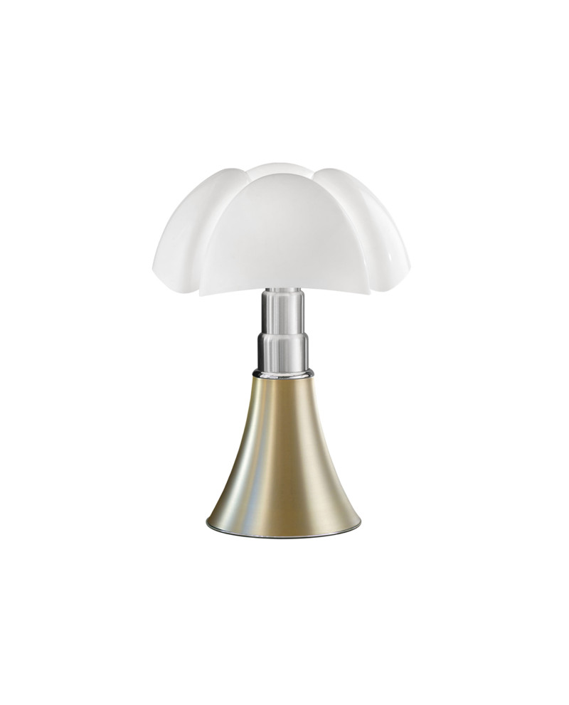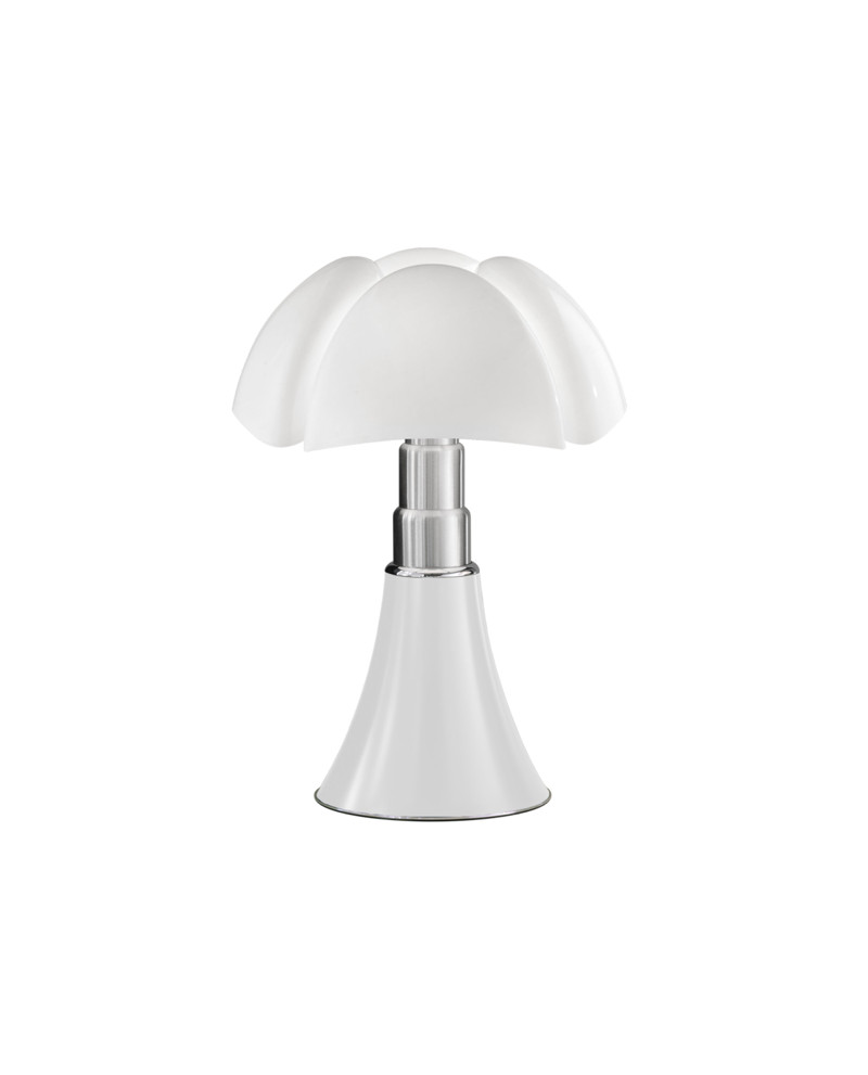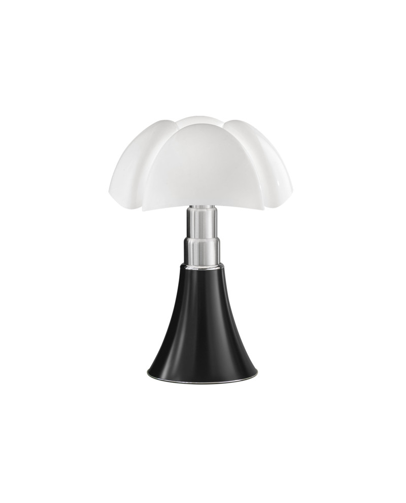 Le diffuseur de cette lampe, dessinée en 1965 par Gae Aulenti pour Martinelli Luce a été réalisée au moyen de techniques de moulage innovantes à l'époque. La forme de la base évasée se développe en hauteur en s'élargissant au niveau des nervures du diffuseur comme les ailes d'une chauve-souris. La lampe, installée sur une table ou bien au sol, exprime toute sa personnalité, dans n'importe quel environnement.