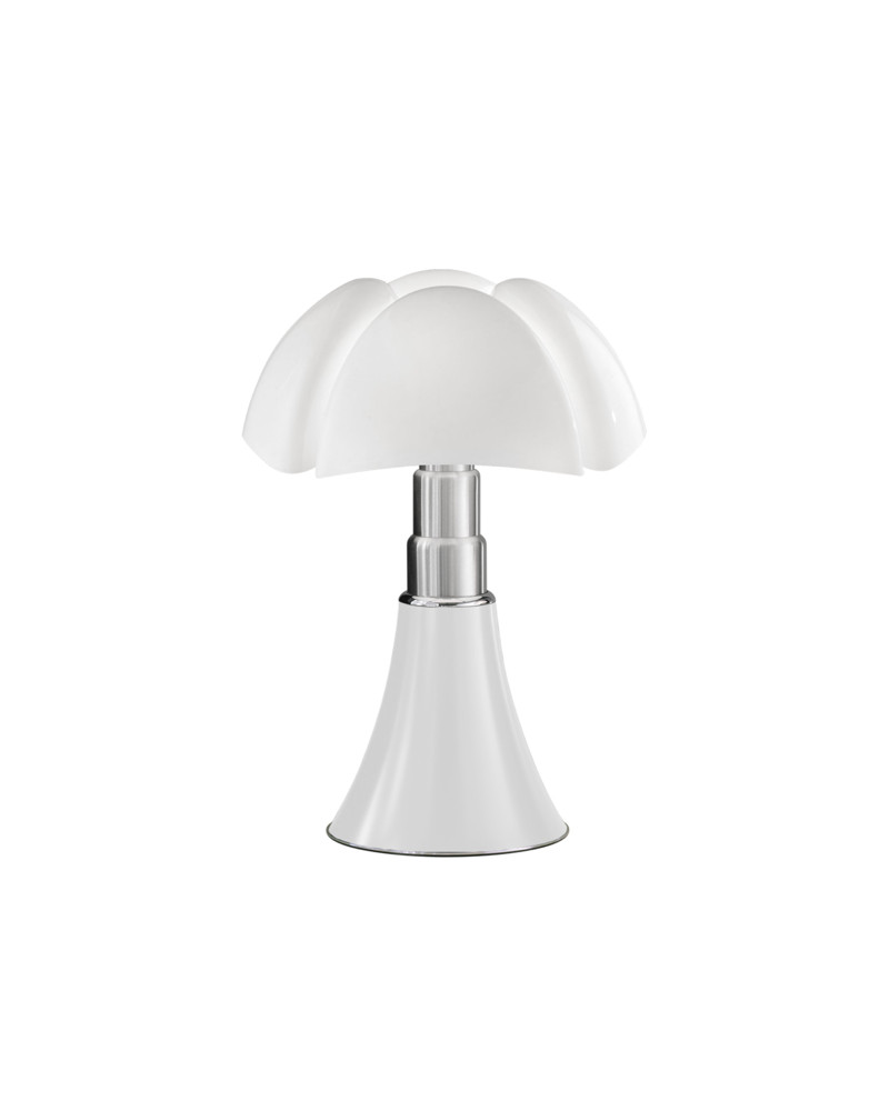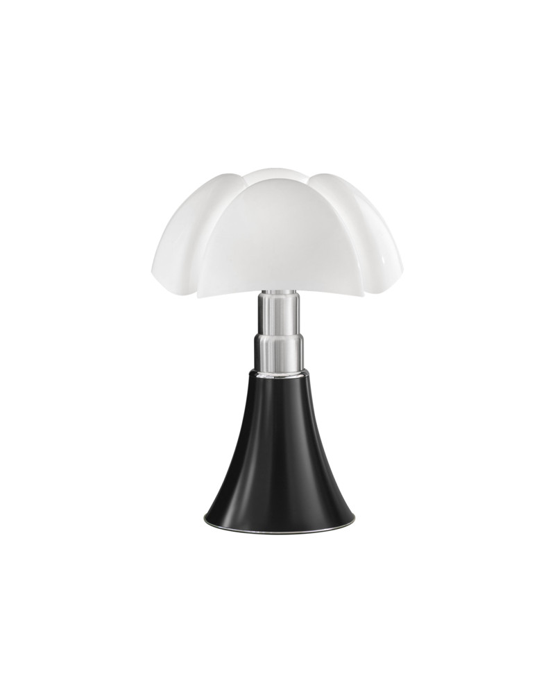 Une version mini de la lampe Pipistrello dessinée par Gae Aulenti en 1965. Lampe de table à lumière diffuse. Télescope en acier inox satiné. Diffuseur en méthacrylate opal blanc. Structure et pommeau en aluminium peint. Source de lumière à LED, dimmable. Driver électronique sur la prise.